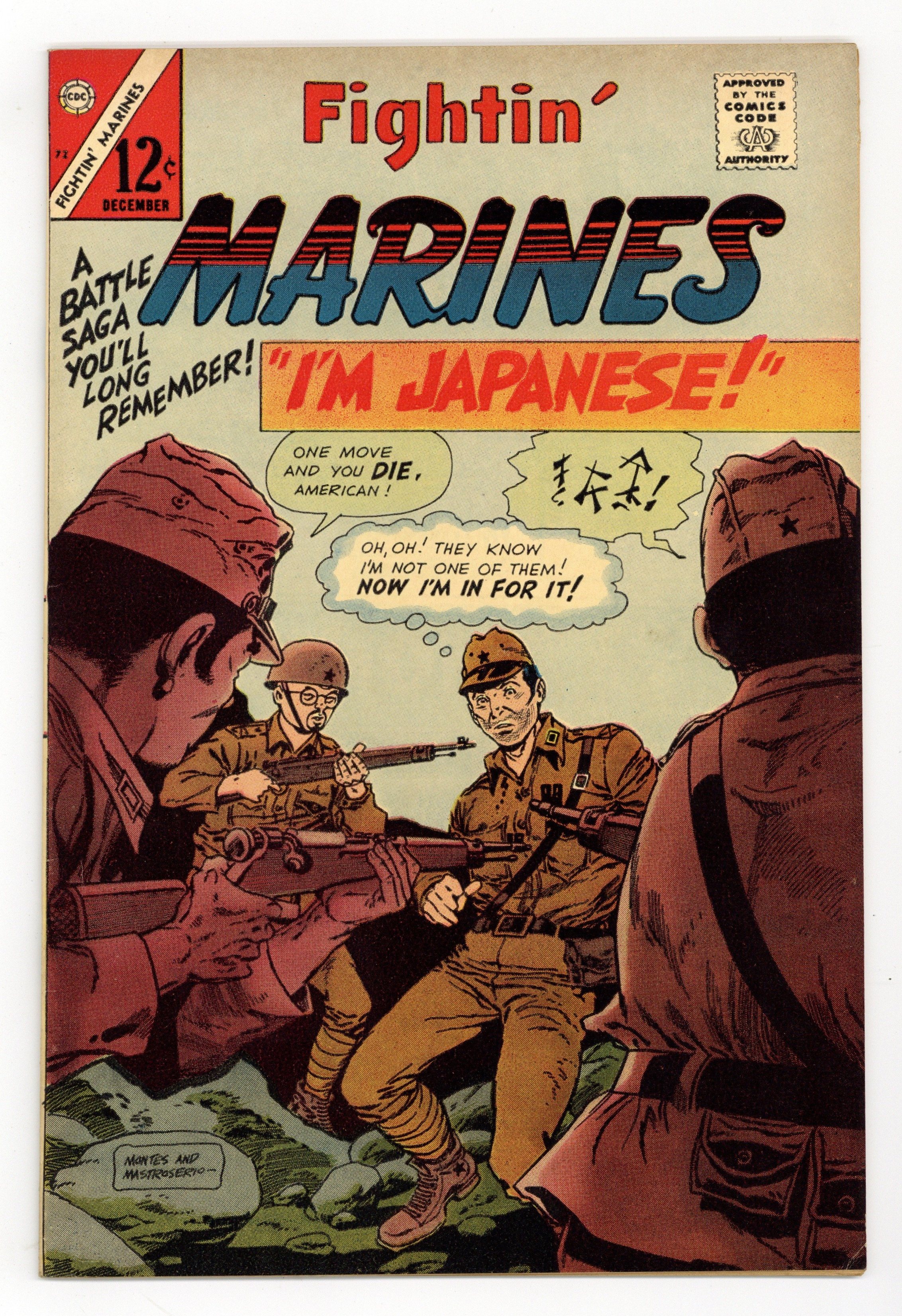Cover by Bill Montes and Rocco "Rocke" Mastroserio. Stories and art by Bill Montes, Ernie Bache, Charles Nicholas and Vince Alascia. Charlton's long-running series focused on the miliary exploits of the US Marines throughout the 20th century. Marine Braun goes on a desperate mission behind enemy lines under cover of darkness in Korea. Learning that he's just become a father changes Johnny's attitude toward the battlefield. Asian-American Gerry enlists in the Marines during World War II. The Longest Night; With Fire and Flame; Don't Play It Safe; The First Days; I'm Japanese. 32 pages, Full Color. Cover price $0.12.