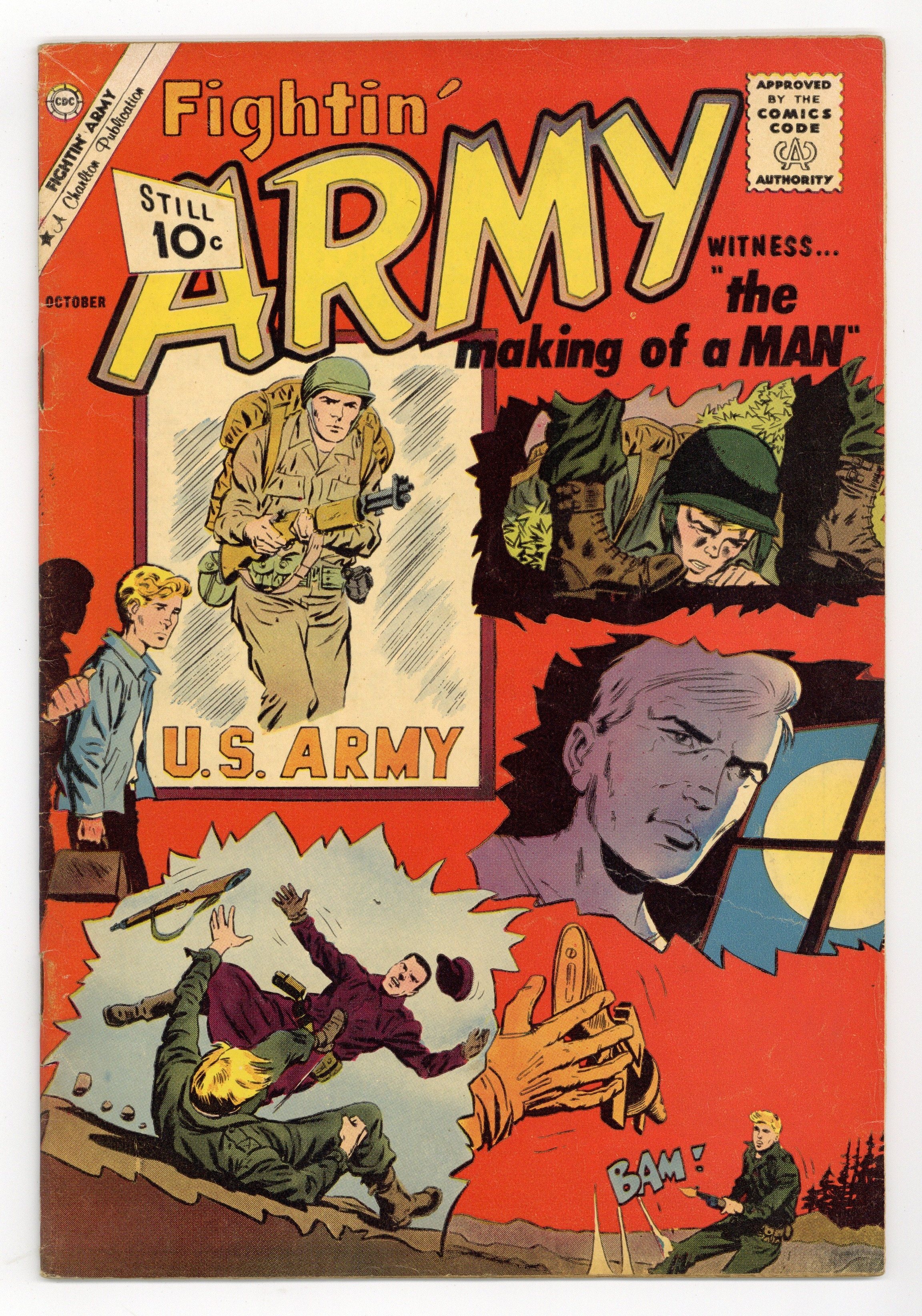 Cover by Jack Abel and Dick Giordano. Stories and art by Bill Molno, Vince Alascia, Jack Abel and Dick Giordano. War comics featuring the US Army in WWII, Korea and other conflicts, part of Charlton's Fightin' military series. Soldiers of immigrant ancestry are recruited for a deep-cover mission during the Cold War. War toughens up a frightened recruit. A downed Air Force pilot and an infantryman don't respect each other, but they must join forces to survive. Operation Boomerang; The Making of a Man; Chip Off the Old Block; 2 Against 10,000. 32 pages, Full Color. Cover price $0.10.