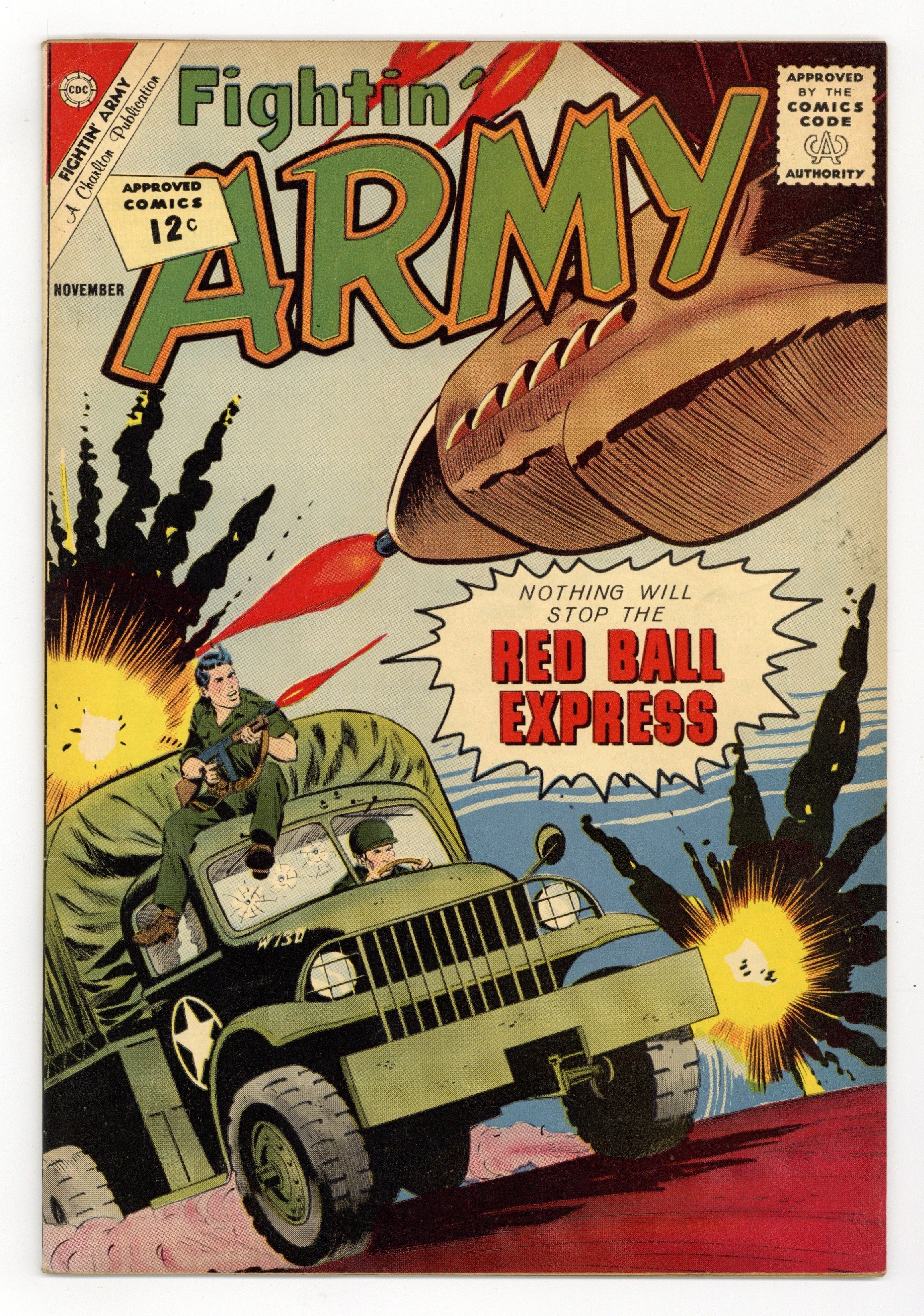 Cover by Dick Giordano. Stories and art by Charles Nicholas, Vince Alascia, Bill Molno, Jack Keller, Rocco "Rocke" Mastroserio, Bill Montes and Ernie Bache. War comics featuring the US Army in WWII, Korea and other conflicts, part of Charlton's Fightin' military series. A Cold War-era tale describes the "Commie K9 Corps" as "gaunt, seldom-fed brutes that were half Siberian wolf...a fearsome foe in the blackness of a Korean night!" A GI in WWII Europe learns the dangers of trucks making ammo runs, at full speed in pitch darkness with no headlights. Plus a PSA about physical fitness, in the Cold War public service announcement "Your Role in the Cold War." The Teeth of the Enemy!; Red Ball Express; Reunion; Vandenberg's Gun; Surly Earley; Are You Physically Fit? 32 pages, Full Color. Cover price $0.12.