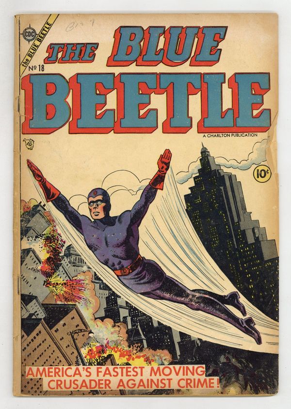 Previous issues titled The Thing, becomes Mr. Muscle #22 on. All stories reprinted from Blue Beetle (1939 Fox/Holyoke) #40. Numbering continues from Thing! (1952) #17. In order of appearance: "Blue Beetle, Masks of Mystery"; "Joan Mason, Reporter, The Spider's Parlor"; "Blue Beetle, The Man Who Stole Twenty-Four Hours!"; and "The Joy Family". "The Golden Cat" illustrated text story. Indicia states: "THE BLUE BEETLE". 36 pages. Full color. Cover price $0.10.