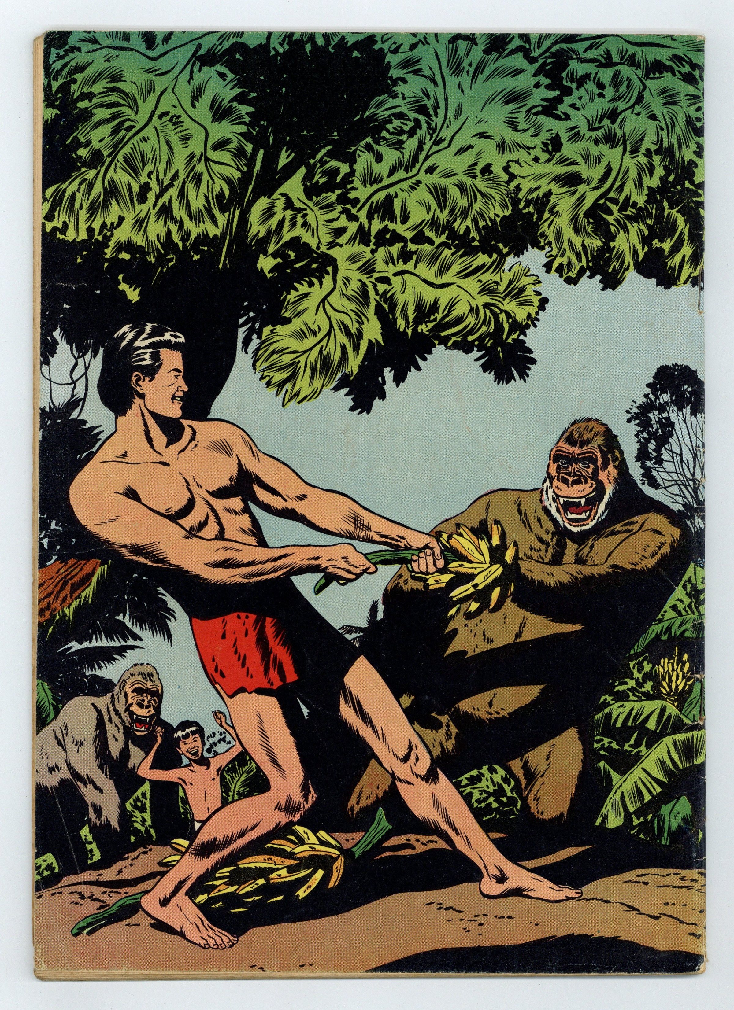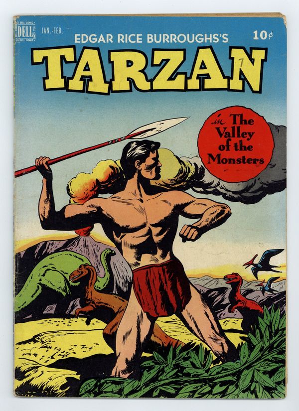 Published Feb 1949 by Dell/Gold Key.$80.00First "Valley of the Monsters" issue. Art cover. Dinosaur cover. "Tarzan and the Valley of the Monsters." Waziri Chief Muviro's grandson and Boy get whisked off to a valley of prehistoric monsters by a runaway hot air balloon. Includes part seven of Jesse Marsh's adaptation of Burroughs' Ape-English Dictionary. Script by Gaylord DuBois, art and cover by Jesse Marsh. 36 pages, full color. Cover price $0.10.