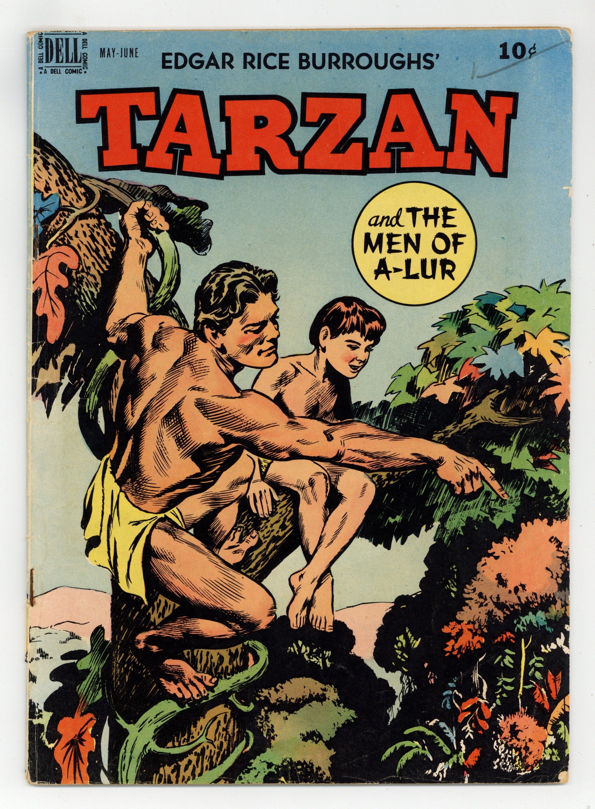"Tarzan and the Men of A-Lur." Boy and the son of a Ho-don king in A-lur get into a fight. This seemingly small skirmish leads to war. Includes part nine of Jesse Marsh's adaptation of Burroughs' Ape-English Dictionary. Script by Gaylord DuBois, art by Jesse Marsh. 36 pages, full color. Cover price $0.10.