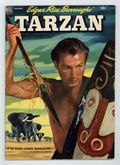 Four stories are included in this issue: "Tarzan and the Cat Men of Crater Lake" (Tarzan faces giant water snakes when he rescues Prince Keelim); "Tarzan Revisits Opar" (Pygmy warriors help Tarzan rescue a greedy treasure hunter's stepsister); "Brothers of the Spear"; and "Sign from the Gods" (a text piece). Art by Jesse Marsh. Lex Barker photo cover. 52 pages, full color. Cover price $0.10.