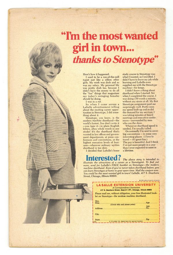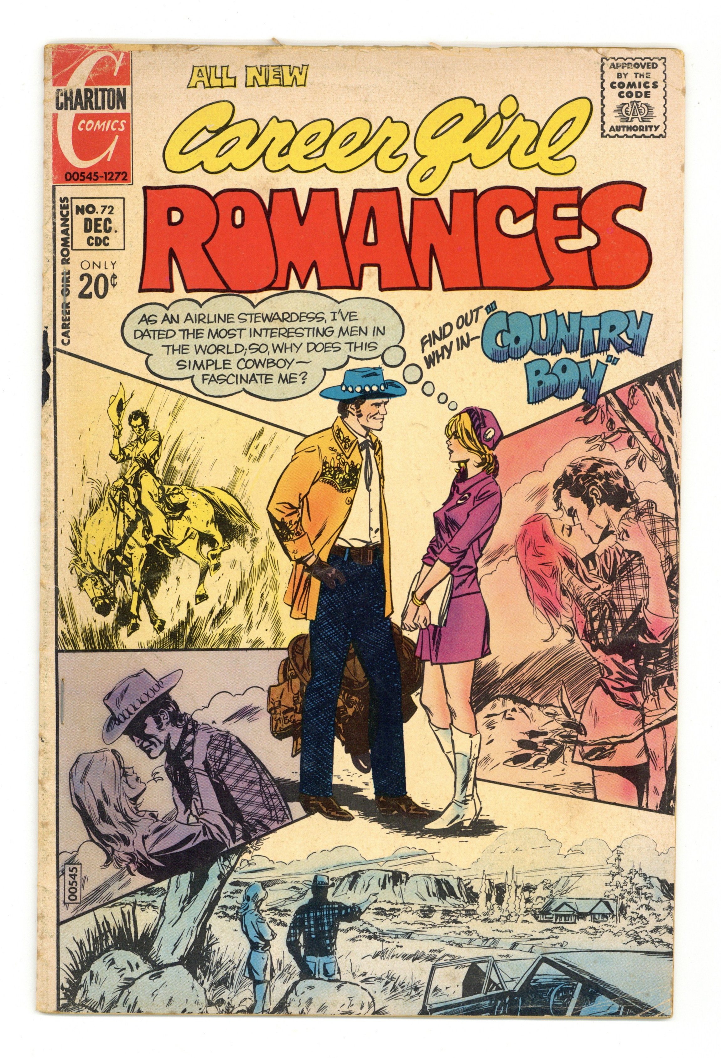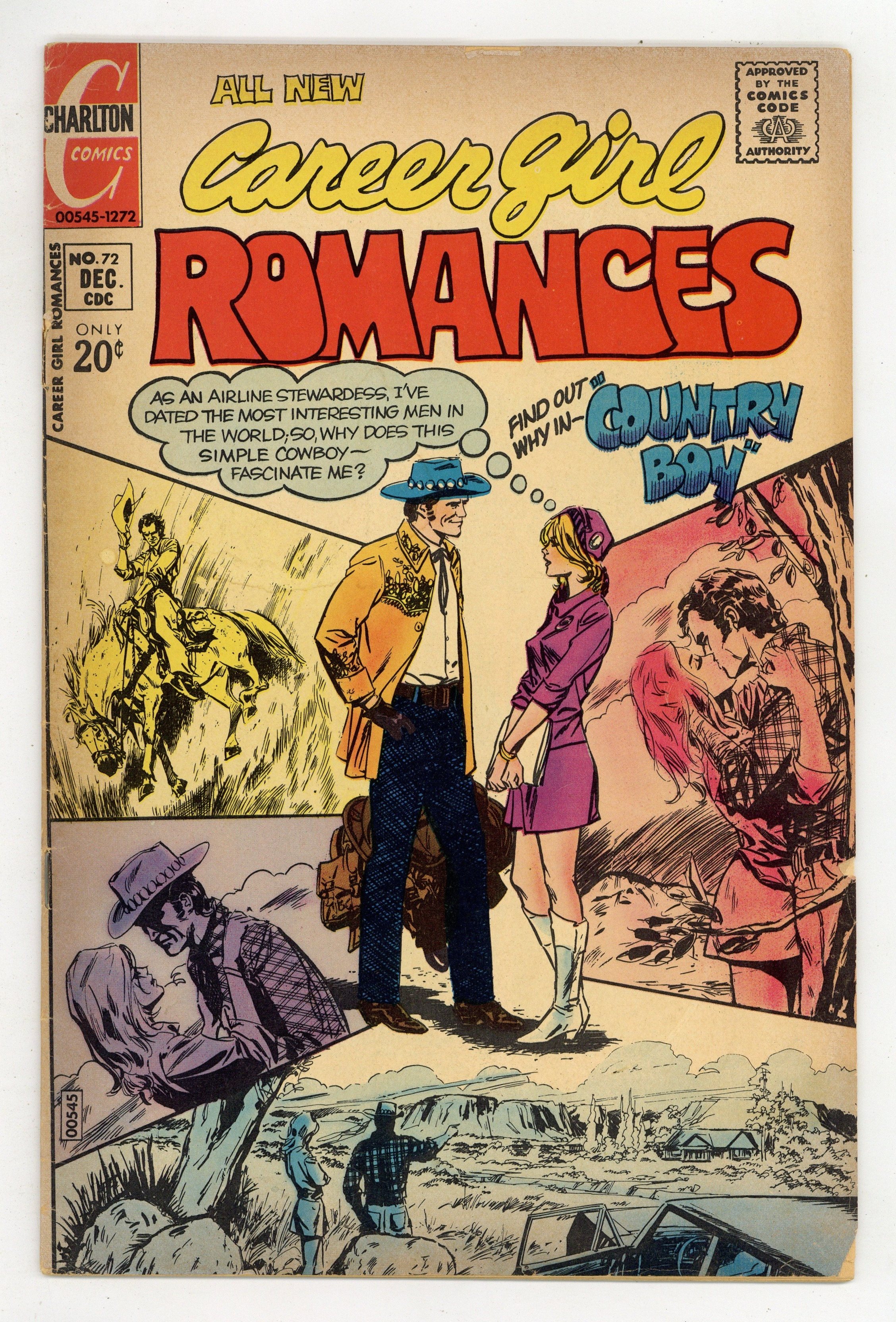 Published Dec 1972 by Charlton Comics Group.$34.00Cover by A. Martinez & Jean Elier. Stories by unknown. Art by A. Martinez & Jean Elier, Charles Nicholas & Vince Alascia and Jack Abel. As an airline stewardess, she has dated the most interesting men in the world! So why does this simple cowboy...fascinate her? Find out in..."Country Boy"! Also featuring: "Will Anyone Care?" and "Take a Letter, Darling"! Plus: 1-page Choosing a Career text piece "Bank Teller" by Jeannette Copeland. 32 pages, full color. Cover price $0.20.