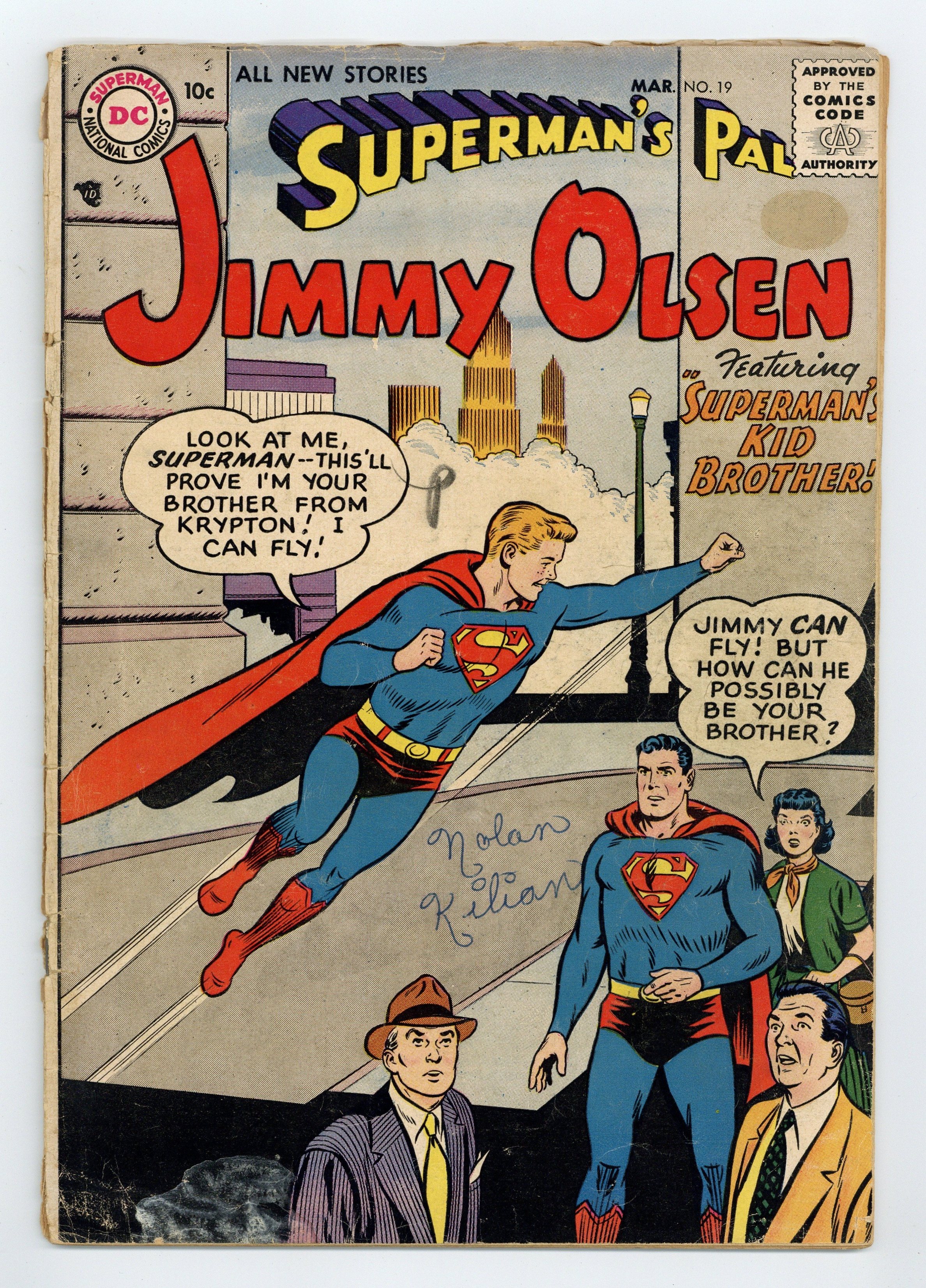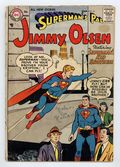 Cover pencils by Curt Swan, inks by Stan Kaye. The Two Jimmy Olsens; a robot double takes Jimmy's place. The Human Geiger Counter; Jimmy clicks like a Geiger counter when near Superman and gold. Superman's Kid Brother; Jimmy Olsen believes he is Superman's younger brother and refers to himself as Superkid. Scripts by Otto Binder, pencils by Curt Swan, inks by Ray Burnley. Shorty humor page, pencils by Henry Boltinoff. Charlie Cannonball humor page by Boltinoff. 36 Pages, Full Color. Cover price $0.10.