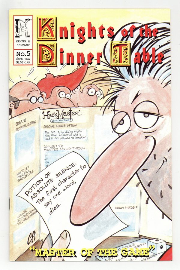 Master of the Game. Story, art and cover by Jolly R. Blackburn. A solid example of how clever writing can compensate for simplified art in comics. The lives and real-world concerns of a group of gamers are revealed by their wacky interplay around the fantasy gaming table. Kenzer & Company takes over publishing for the remainder of the series run. Spaced Out; Conquer and Deny; Beating the Odds; Cant Buy Me Luck; Agent of Evil!!; KODT Idea Search; Brians Small Press Picks; Parting Shots. 32 pages, B&W. First printing. NOTE: Any second printing, will be so marked by the publisher. Cover price $2.95.