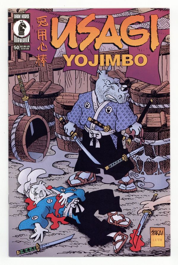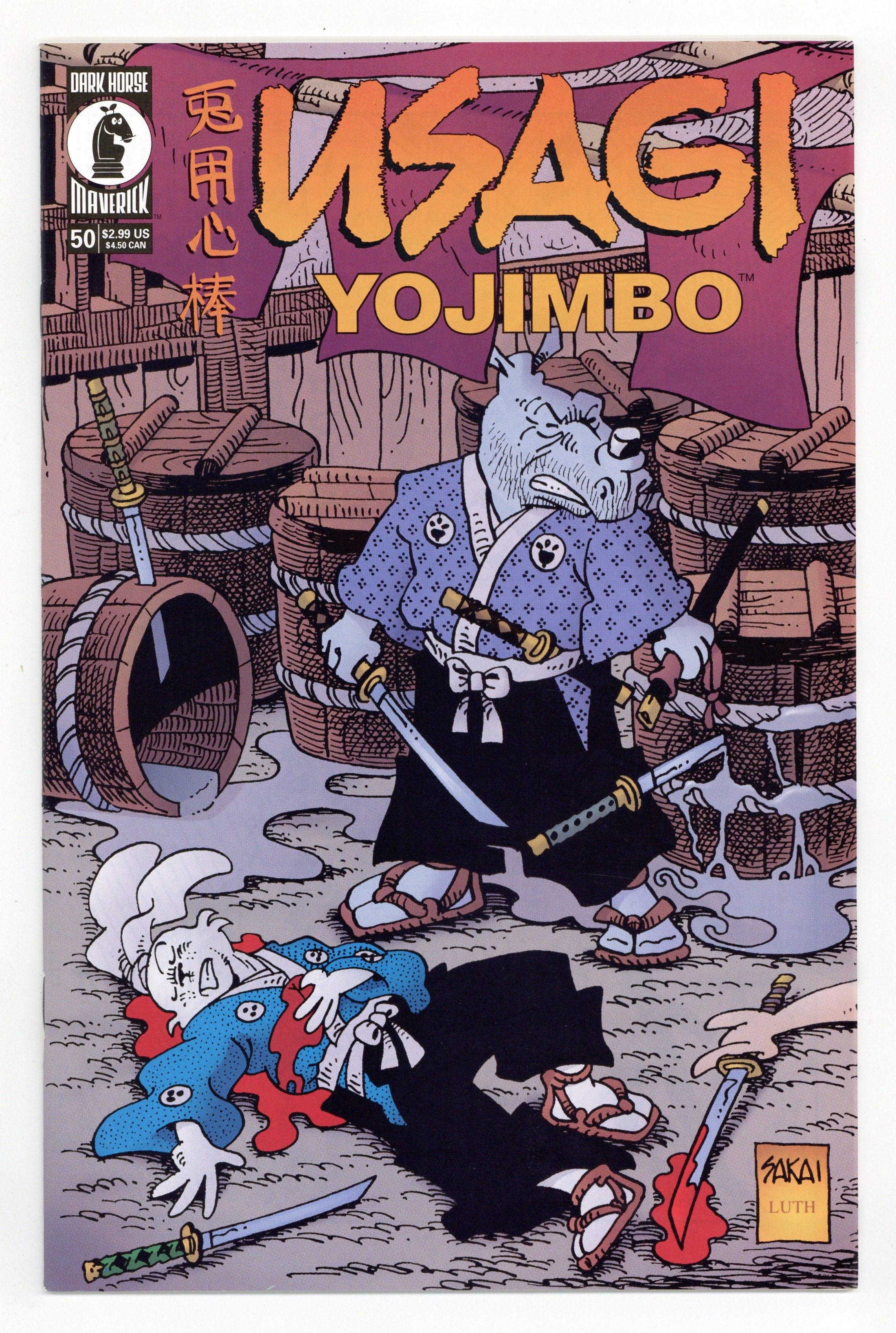 Published Jul 2001 by Dark Horse.$12.00Story and art by Stan Sakai. Usagi? Dead? Oh, no! This can't be. But there he is, lying on the ground in a pool of his own blood, dead at the hands of Yakuza thugs. This may be the darkest hour yet. And it's all because of that foolish Kitsune, the thief/street entertainer, who crossed the wrong people. Usagi was only recently coming to terms with his rash decision-making problem. Now it seems like he's only got a "ghost" of a chance to achieve that greater depth of patience. Join us for the most shocking issue of Usagi Yojimbo yet. 32 pages, B&W. Cover price $2.99.