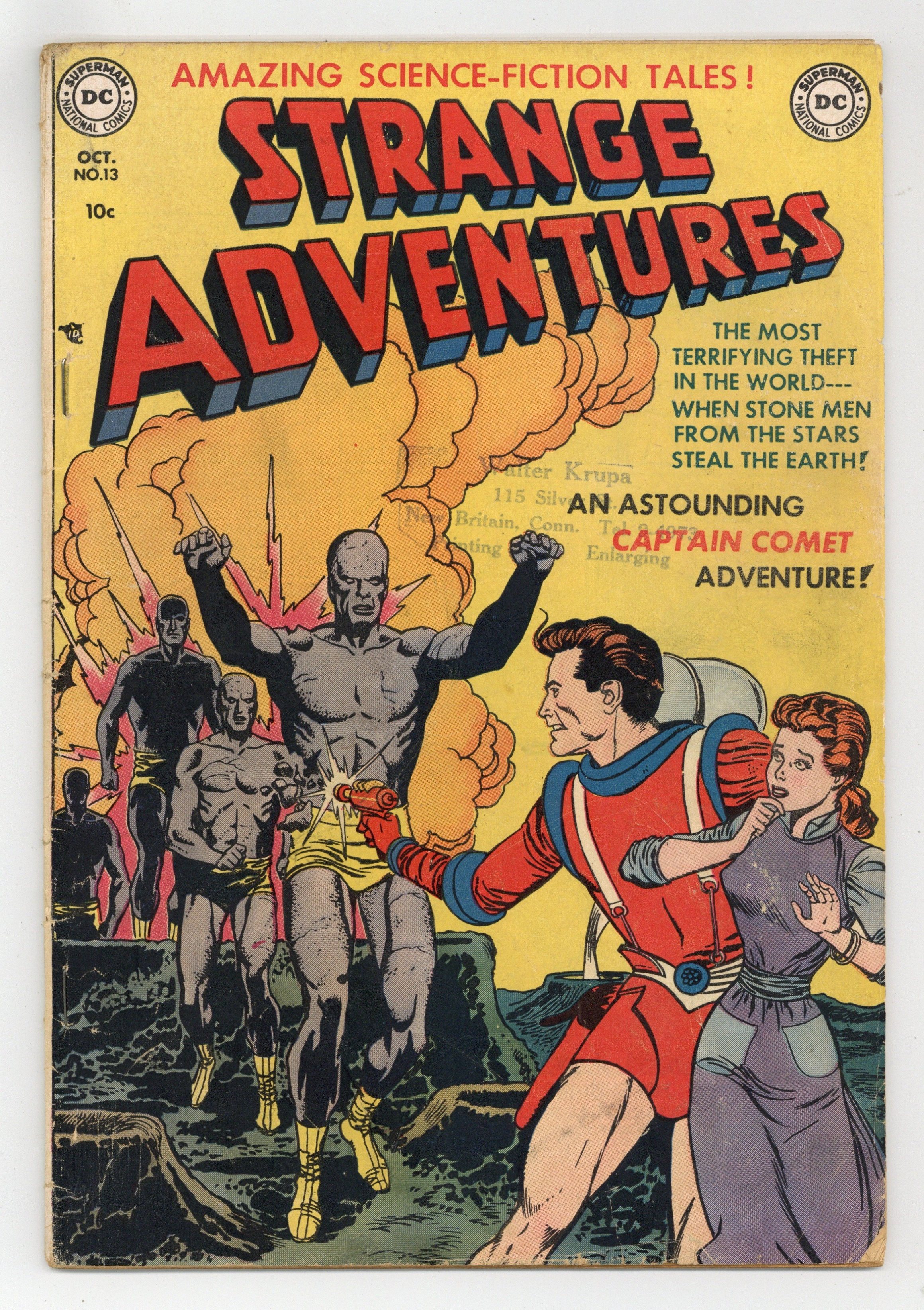 Captain Comet stars in "When the Earth Was Kidnapped!" (story by Edgar Ray Merritt, art by Murphy Anderson); "Artist of Other Worlds!" (story by Edmond Hamilton, art by Alex Toth); "The Man Who Televised Time!" (story by Gardner Fox; art by Gil Kane/Carmine Infantino?); and "The Hidden People!" (story by Hugh Davidson). Kane cover pencils. 44 Pages, Full Color. Cover price $0.10.