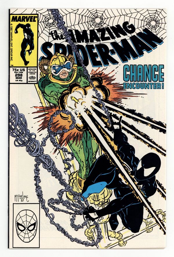 Tags: Marvel Legacy Numbering: Amazing Spider-Man (part 298), Spider-Man$105.00Direct Edition. "Chance Encounter!" Part 1 of 2. Script by David Michelinie. Pencils by Todd McFarlane. Inks by Bob McLeod. Cover by Todd McFarlane. Chance is back in business and working a new job for the Life Foundation! The clandestine organization wants Chance to steal an arms shipment coming into the west side docks! That should be a piece of cake for the high-flying mercenary! However, the Daily Bugle dispatches an undercover photographer to observe the delivery! And beneath the moonlit sky, fireworks explode when Chance and the Amazing Spider-Man throw down on the docks! First appearance (and cameo on the last page) by Eddie Brock (aka Venom). First appearance of Carlton Drake of the Life Foundation. Cameo appearances by Mary Jane Watson, Joy Mercado, and Joe Robertson. (Notes: Chance previously appeared in Web of Spider-Man 15. This issue begins Todd McFarlane's 2-year run as the penciler of the Amazing Spider-Man series.) 36 pages. Cover price $0.75.