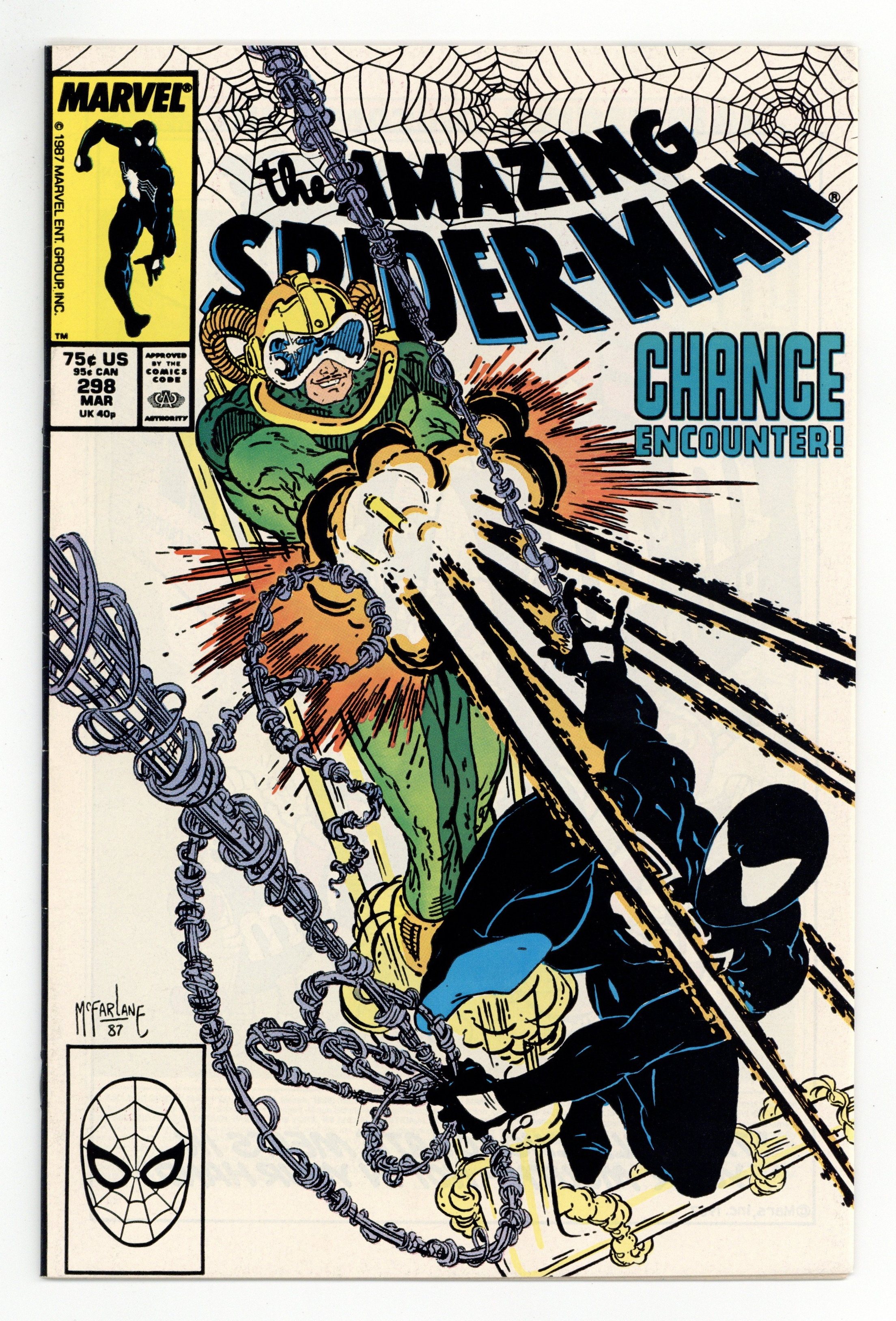 Tags: Marvel Legacy Numbering: Amazing Spider-Man (part 298), Spider-Man$83.00Direct Edition. "Chance Encounter!" Part 1 of 2. Script by David Michelinie. Pencils by Todd McFarlane. Inks by Bob McLeod. Cover by Todd McFarlane. Chance is back in business and working a new job for the Life Foundation! The clandestine organization wants Chance to steal an arms shipment coming into the west side docks! That should be a piece of cake for the high-flying mercenary! However, the Daily Bugle dispatches an undercover photographer to observe the delivery! And beneath the moonlit sky, fireworks explode when Chance and the Amazing Spider-Man throw down on the docks! First appearance (and cameo on the last page) by Eddie Brock (aka Venom). First appearance of Carlton Drake of the Life Foundation. Cameo appearances by Mary Jane Watson, Joy Mercado, and Joe Robertson. (Notes: Chance previously appeared in Web of Spider-Man 15. This issue begins Todd McFarlane's 2-year run as the penciler of the Amazing Spider-Man series.) 36 pages. Cover price $0.75.