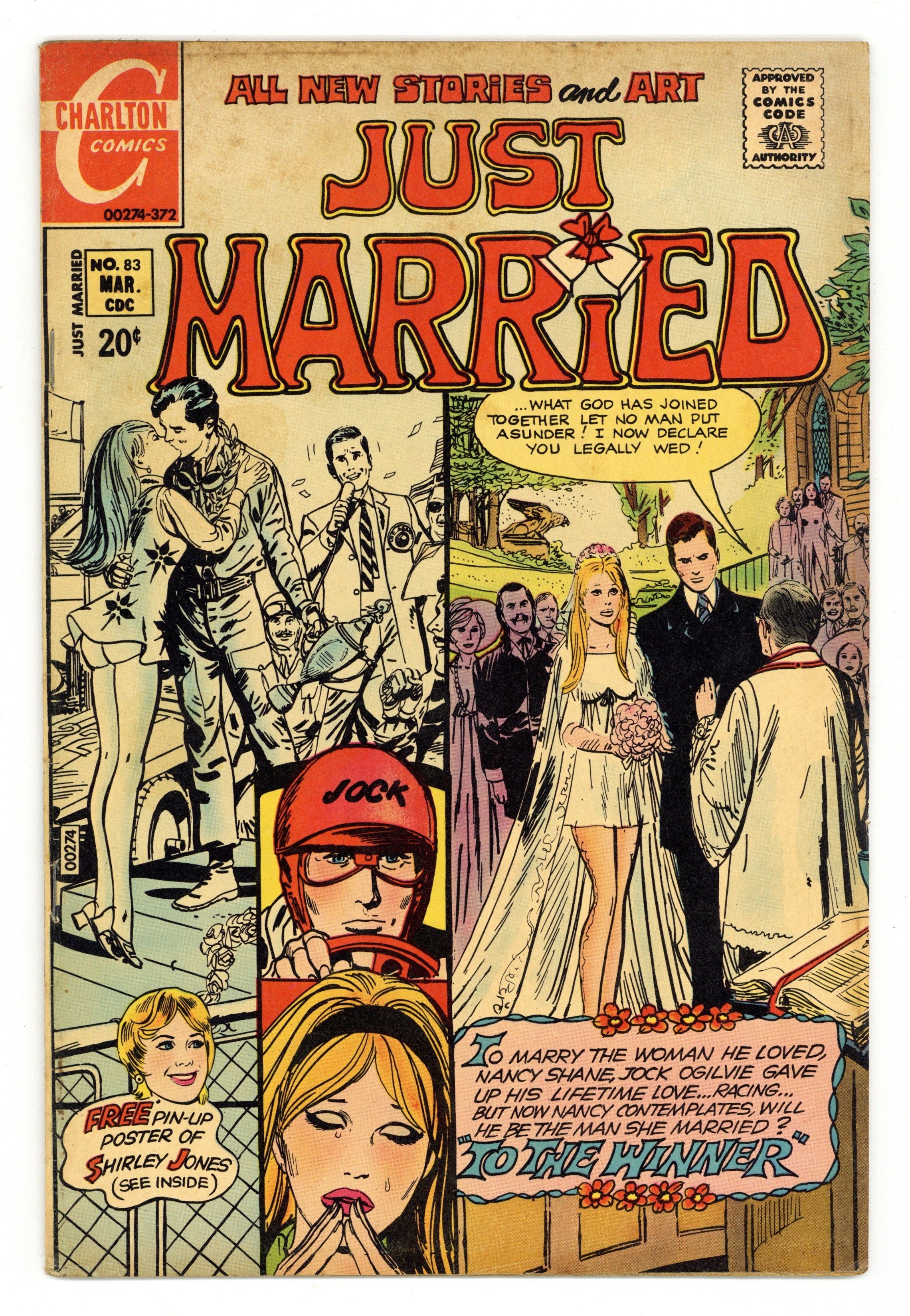 Published Mar 1972 by Charlton Comics Group.$12.00Cover by Luis Avila. Stories and art by Luis Avila, Don Sherwood, Vince Alascia, Sururi Gumen and Norman Nodel. Charlton's long-running romance comic focused on the stormy passions of newlyweds. Nancy demands that Jock give up racing if he wants to marry her, but even though he agrees, she worries that he's changed too much now. Donna feels jealous of Hal's new secretary Abigail, and even more so when she sees what Abigail looks like. Plus a pinup of Partridge Family TV star Shirley Jones. To the Winner; Married in Haste; Young in Heart. 32 pages, Full Color. Cover price $0.20.