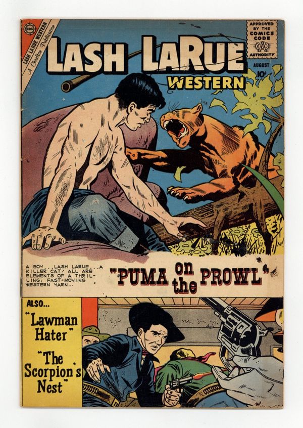 Published Aug 1960 by Fawcett/Charlton.$12.75Cover by Pete Morisi. Stories and art by Pete Morisi, Charles Nicholas, Sal Trapani, Bill Molno and Vince Alascia. Movie cowboy Lash Larue is known for his trademark black outfit and his skill with a bullwhip. "Roving marshal" Lash ventures deep into the desert to capture the outlaw gang called the Scorpions. A rancher disguises himself as Lash Larue to scare off homesteaders settling near his property, and that doesn't set well with Lash Larue. Handsome outlaw Cato behaves suspiciously lawfully when Monk Ammen's gang busts him out of custody and escorts him to the lawless town of Locoweed. Puma on the Prowl; Lawman Hater; Horse Sense; Killer Loose; The Scorpions Nest. 32 pages, Full Color. Cover price $0.10.