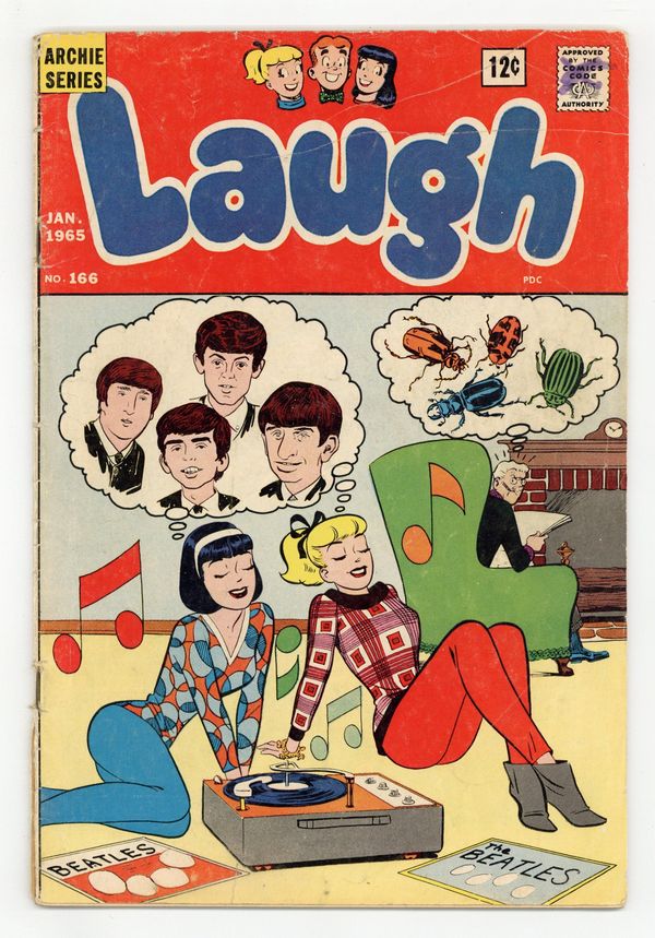 Beatles cover. Cover pencils by Harry Lucey, inks by Mario Acquaviva. "Mad Plaid," script by Frank Doyle, pencils by Harry Lucey, inks by Mario Acquaviva; Betty gives Archie's torn plaid coat to a friend to be repaired; After getting it fixed, Betty's friend wears the coat home and causes Veronica to have an accident, causing her to vow revenge on whoever owns that coat. "Betty's New Look in Fashions" and "Fall Fashions for Veronica," pencils by Dan DeCarlo, inks by Rudy Lapick. "Disc-Gusted," pencils by Dan DeCarlo, inks by Rudy Lapick; Betty and Veronica tie up the phone line all night trying to get a request in to a disc jockey. "Snow Joke!", script and art by Joe Edwards; Li'l Jinx and Greg build a snowman. "Crack Up," script by Frank Doyle, pencils by Harry Lucey, inks by Mario Acquaviva; Moose is planning to beat Archie up after school, so Archie tries to get detention. 36 pgs., full color. Cover price $0.12.