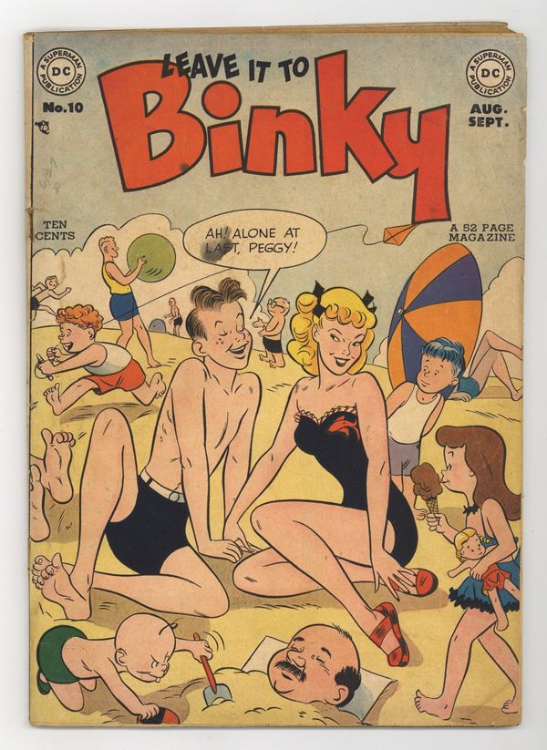 Cover art by Bob Oksner. The Race, script by Hal Seeger, art by Bob Oksner; Uncle Snootly enters the guys in a relay race at the local Fireman's Picnic against the Van Roy clan, and he expects them to win. Safety First public service announcement starring Superman, script by Jack Schiff, pencils by Win Mortimer. A Balanced Education, script by Hal Seeger, art by Bob Oksner; When Pa sees Lucy taking a book of classic poetry up to her room, he runs out and buys her more classics in hopes of encouraging her literary spirit. Three's a Crowd, script by Hal Seeger, art by Bob Oksner; Out of gratitude for a good deed, Peggy invites Sherwood along on her soda date with Binky; The two spend the date competing for Peggy's favor. Soozie's Birthday Demand, art by Bob Oksner; Soozie strongly hints that Allergy better buy her a birthday present, or else. Repondez S'il Vous Plait, art by Bob Oksner. High Flying Binky, script by Sheldon Mayer, art by Bob Oksner. 52 pgs. $0.10. Cover price $0.10.