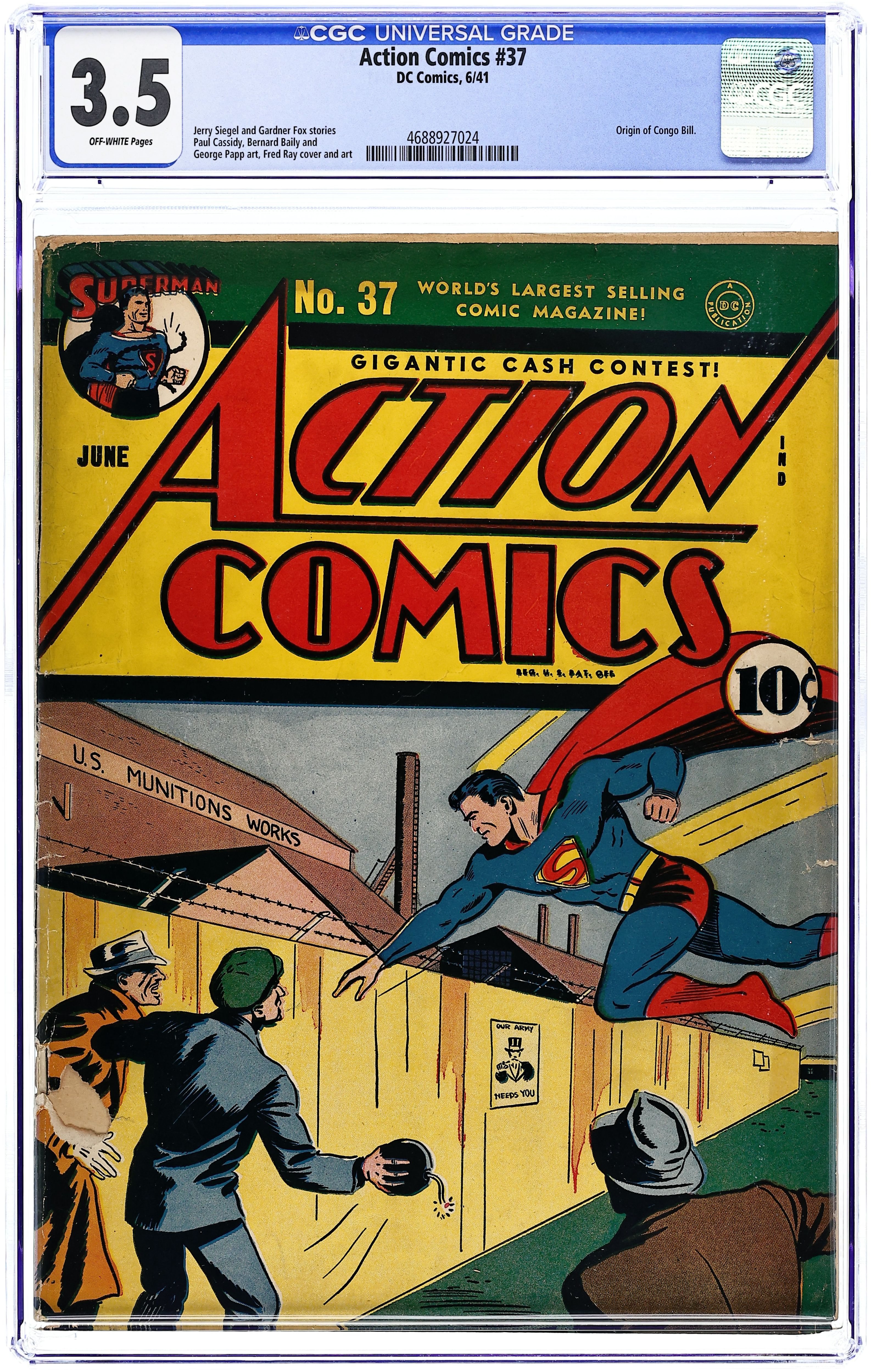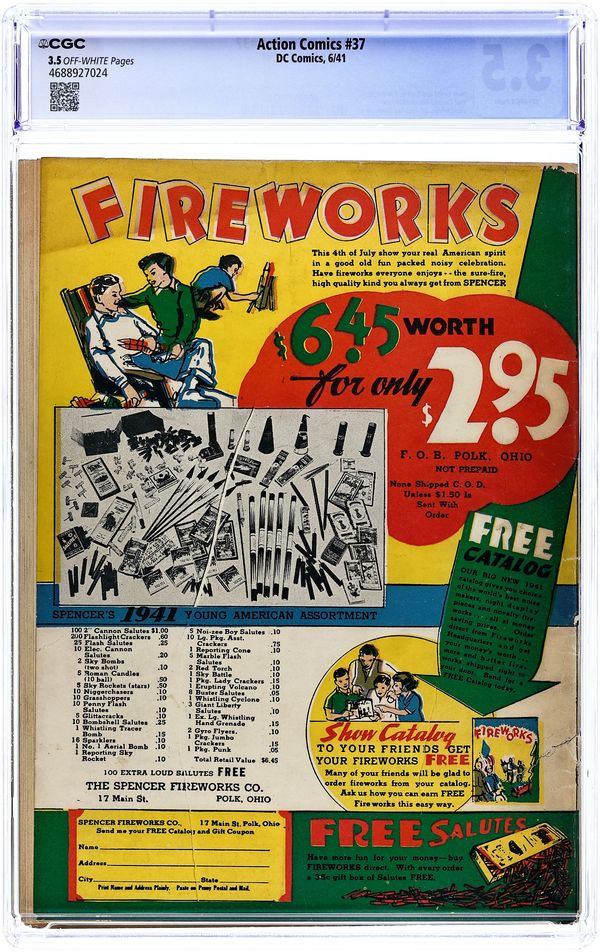 Cover art by Fred Ray. Superman story, script by Jerry Siegel, art by Paul Cassidy (signed as Joe Shuster). Pep Morgan story, art by George Papp. The Lost City of Atlantis starring Three Aces, script by Gardner F. Fox, art by Chad Grothkopf. Mr. America story, script by Ken Fitch, art by Bernard Baily. Congo Bill story, art by Fred Ray. Zatara story, script by Gardner F. Fox, art by Joseph Sulman. 68 Pages, Full Color. $.10 Cover price $0.10.