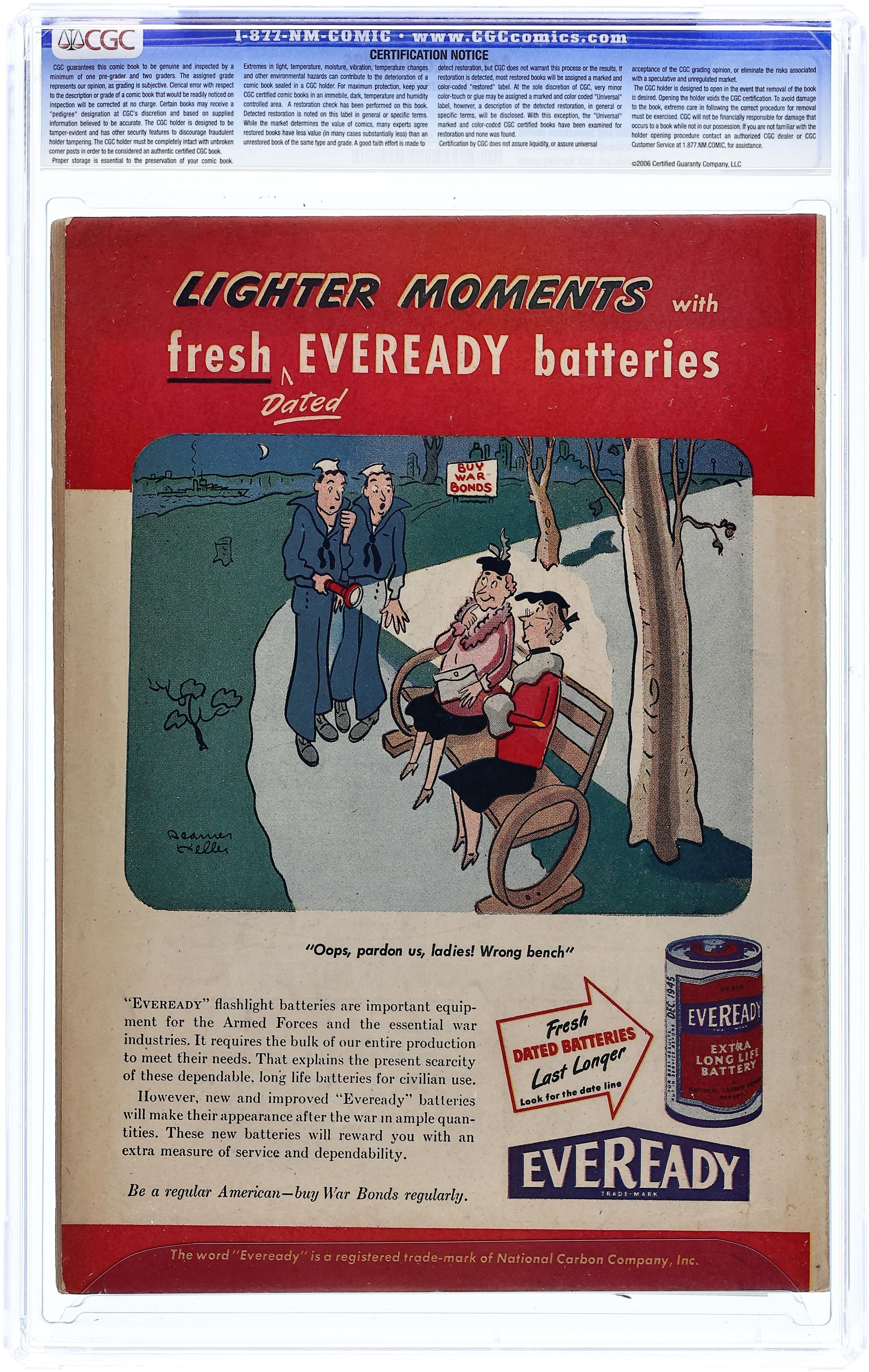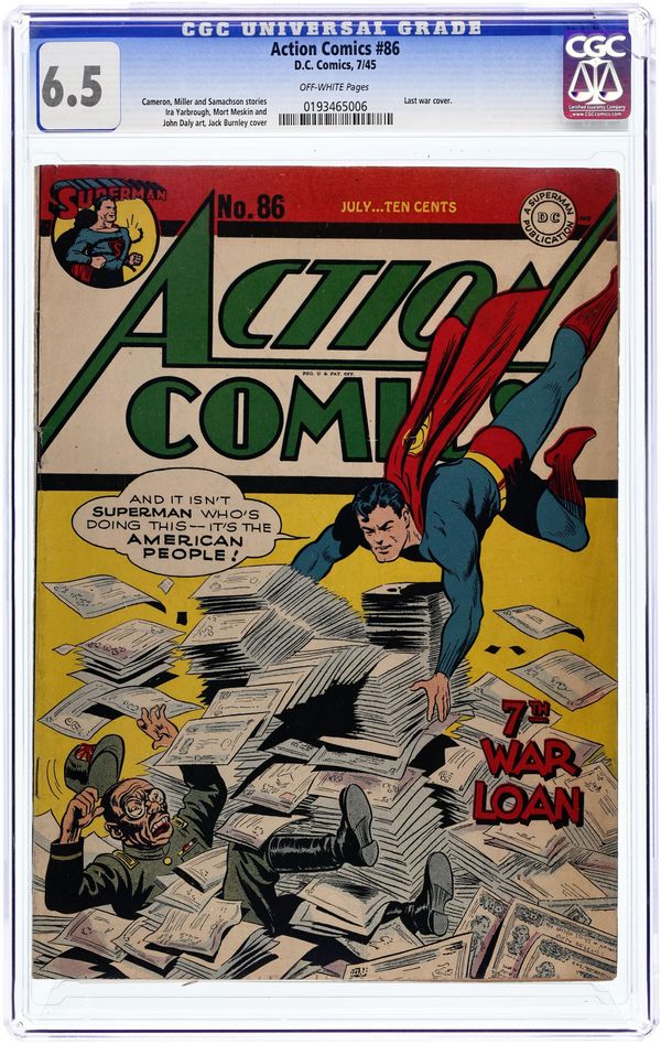 War Loan cover - Cover art by Jack Burnley and Stan Kaye. The Enchanted Mountain starring Superman, script by Don Cameron, art by Ira Yarbrough. Mysterious Marauder starring Congo Bill, script by Jack Miller, art by John Daly. Orient of the Occident starring The Vigilante, script by Joe Samachson, art by Mort Meskin (signed as Mort Morton Jr.). The Pyrotechnician starring Hayfoot Henry, art by Stan Kaye. Crime--Off the Record starring Zatara, art by William F. White. 52 Pages, Full Color. $.10 Cover price $0.10.