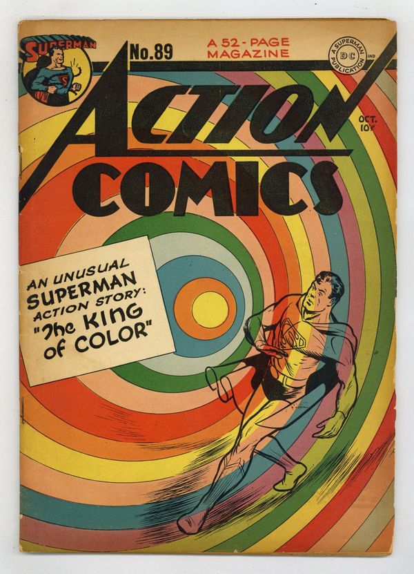Classic rainbow cover by Wayne Boring and Stan Kaye. The King of Color starring Superman, art by Ira Yarbrough. The Elephant's Homecoming starring Congo Bill, art by Edwin Smalle. An Ill Wind Blows starring Hayfoot Henry, script by Al Schwartz, art by Stan Kaye. The Curse of the Ichabod Q starring Vigilante, art by Mort Meskin (as Mort Morton Jr.). Race Against Rogues starring Zatara, art by W. F. White. 52 Pages, Full Color. $.10 Cover price $0.10.