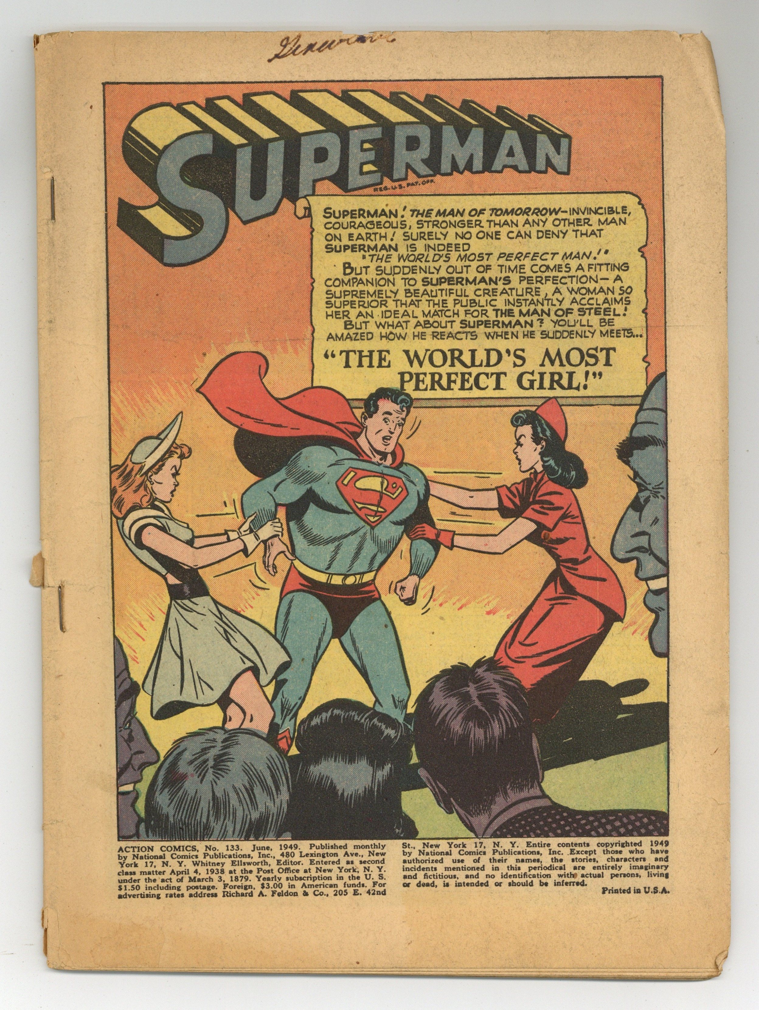 Cover art by Al Plastino. The World's Most Perfect Girl starring Superman, script by William Woolfolk, art by Al Plastino. Hollywood of Space starring Tommy Tomorrow, script by Otto Binder, pencils by Curt Swan, inks by John Fischetti. The Man Who Hunted Thrills starring Congo Bill, art by Ed Smalle. The Gold Rush Comes to Gotham Cit starring Vigilante, script by John Broome, art by Dan Barry. 52 Pages, Full Color. $.10 Full-page ad for Superboy #2. Cover price $0.10.