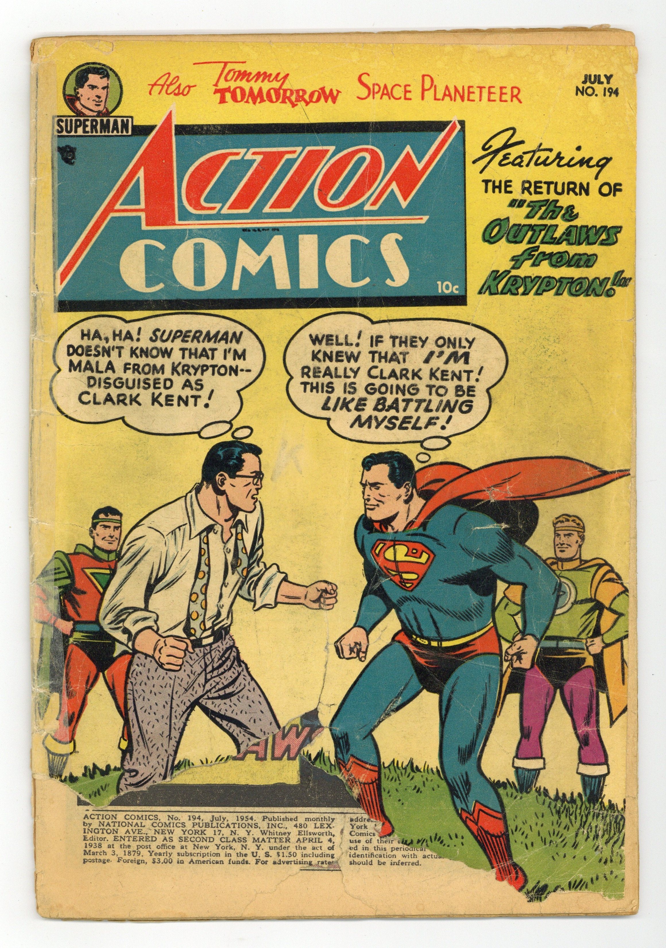 Cover art by Al Plastino. The Outlaws from Krypton starring Superman, script by Bill Finger, pencils by Wayne Boring, inks by Stan Kaye. The Bare-Handed Hunter starring Congo Bill, art by Ed Smalle. The Impossible Space Ship starring Tommy Tomorrow, art by Jim Mooney. The Unlucky Horseshoe starring Vigilante, script by Dick Wood, art by Howard Sherman. 44 Pages, Full Color. $.10