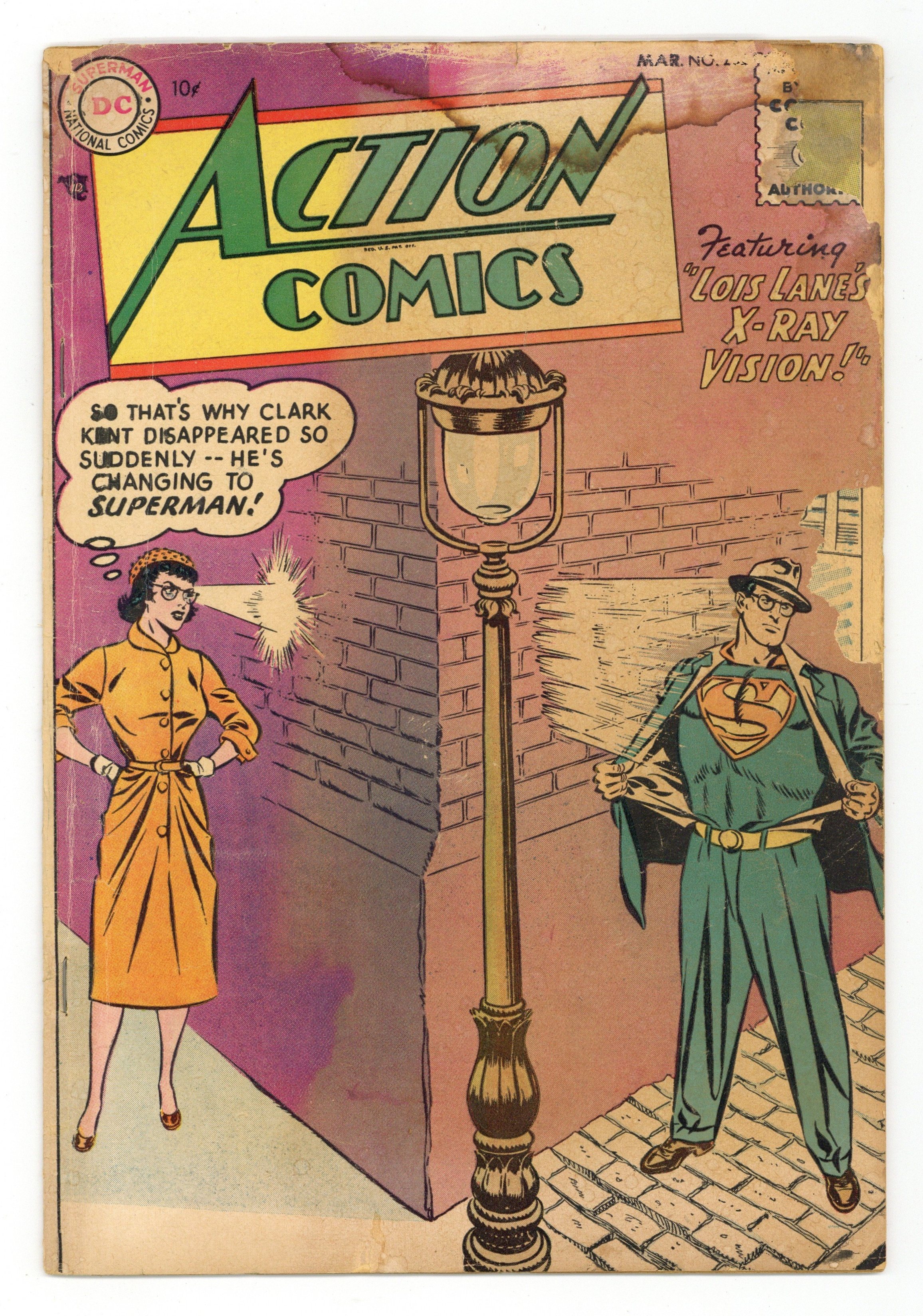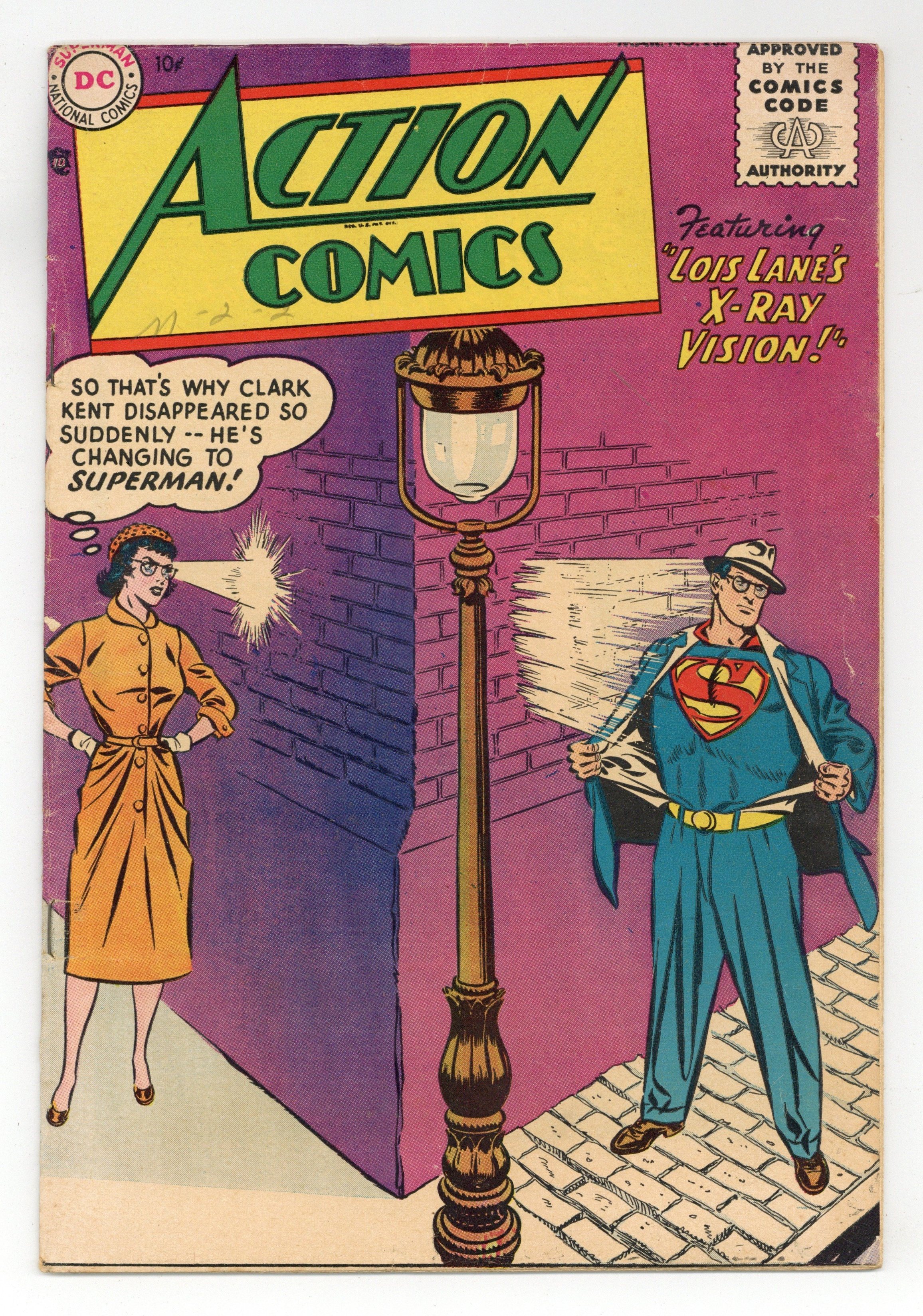 Cover pencils by Wayne Boring, inks by Stan Kaye. "Lois Lane's X-Ray Vision!", pencils by Wayne Boring, inks by Stan Kaye; Lois Lane acquires a pair of specially-treated glasses that give her X-ray vision. "The Space Dragnet!", script by Otto Binder, art by Jim Mooney; Tommy Tomorrow vs. Jon Crane. Shorty one-page story by Henry Boltinoff. Peg one-page story by Henry Boltinoff. "The Jungle Amusement Park!" starring Congo Bill, art by Ed Smalle. 36 Pages, Full Color. $.10 Cover price $0.10.