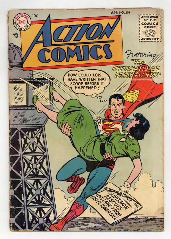 Cover by Al Plastino. Don't Be Afraid to Speak Up! public service announcement starring Peter Porkchops, script by Jack Schiff, art by Rube Grossman. "The International Daily Planet," pencils by Wayne Boring, inks by Stan Kaye; When Clark Kent, Lois Lane, and Jimmy Olsen are assigned to foreign offices of the Daily Planet overseas, Superman must save his two friends from smugglers who have captured them. One-page Daffy Doodle story. One-page Varsity Vic story by Henry Boltinoff. "Congo Bill, Gladiator," art by Ed Smalle. 36 Pages, Full Color. $.10 Cover price $0.10.