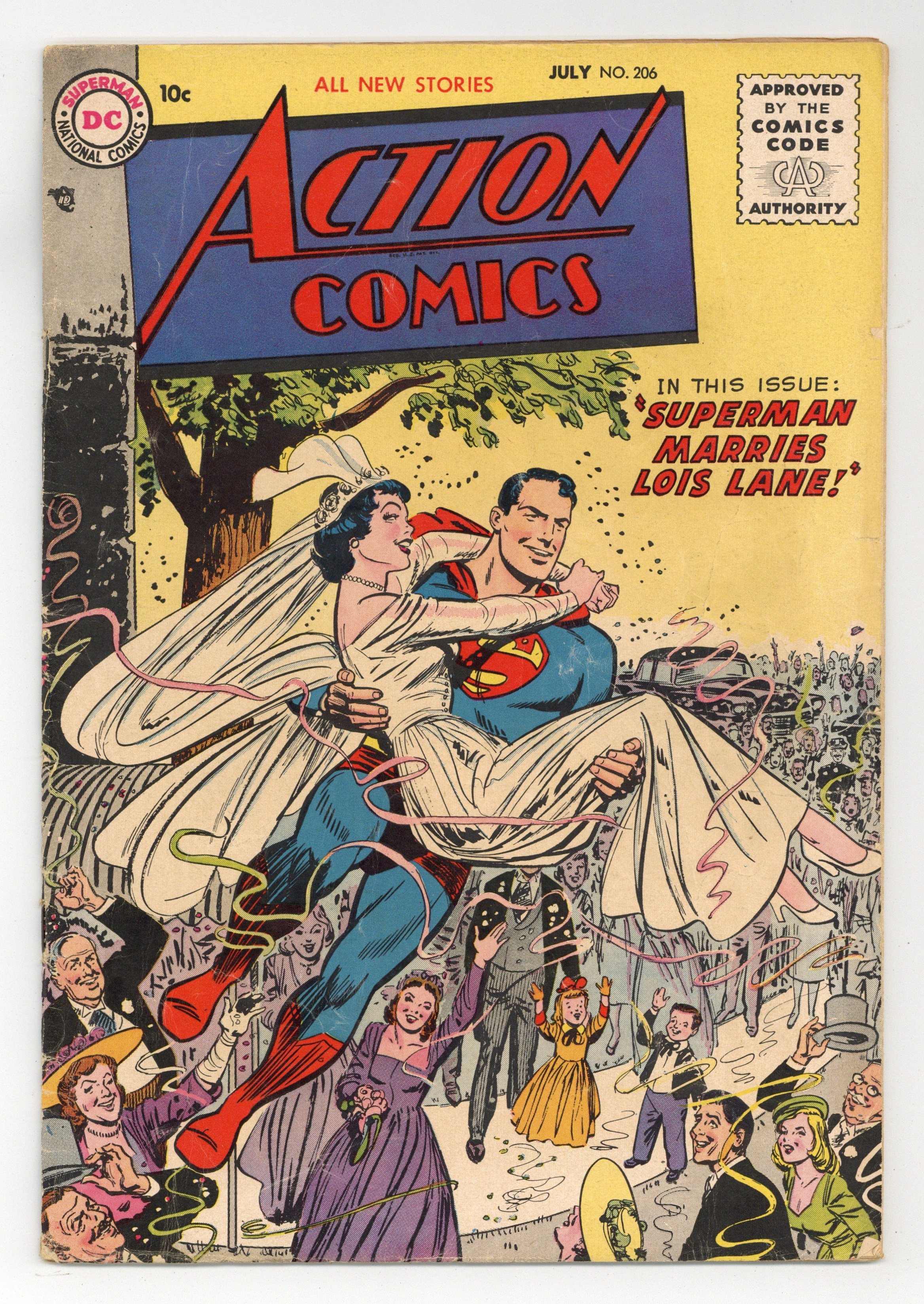 Tags: Superman$160.00Cover by Win Mortimer. "Superman Marries Lois Lane," pencils by Wayne Boring, inks by Stan Kaye; Lois Lane has a dream of her potential married life with Superman. One-page Shorty story by Henry Boltinoff. "Destination Future" starring Tommy Tomorrow, script by Otto Binder, art by Jim Mooney. Two-page On the Set story by Henry Boltinoff. "The Heat's on in Yuma" text story by Ronald M. Deutsch, art by Raymond Perry. "The Mystery of the Jungle Monuments" starring Congo Bill, art by Ed Smalle. 36 Pages, Full Color. $.10 Cover price $0.10.