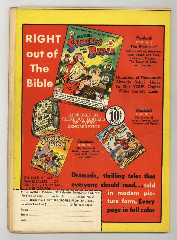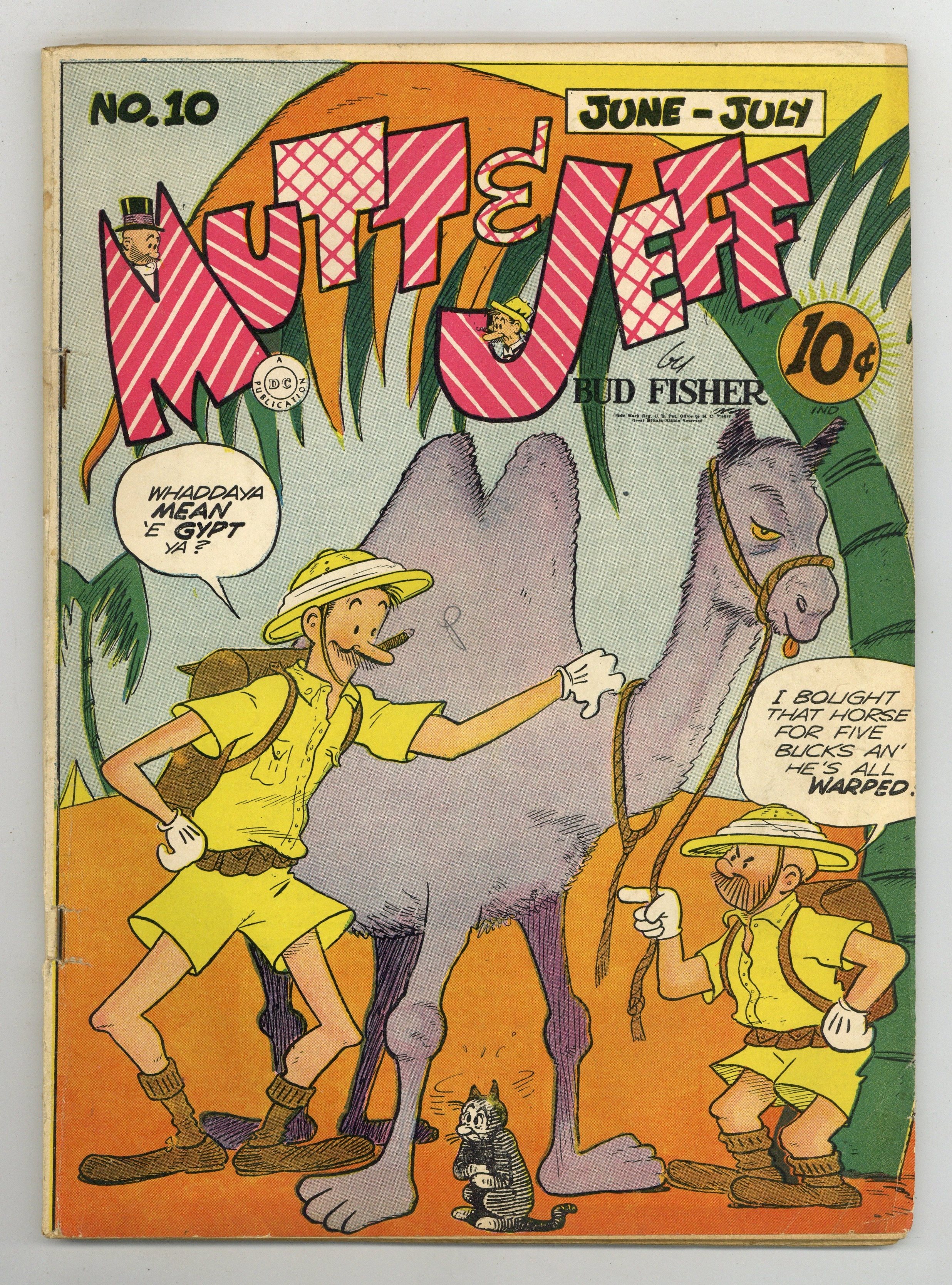 Cover by Sheldon Mayer (credited as Bud Fisher). Stories and art by Al Smith (credited as Bud Fisher), A. W. Nugent, Falcon Mathieu, Sol Hess, and W. A. Carlson. All-American/ DC reprints the comic strip that defined the comic strip, featuring the original tall-and-short comedy duo. Also featuring the "topper" strip Cicero's Cat, and other strips from bygone days. Jeff puts his cow in the bathtub so he can milk it without knocking over the pail. Cicero's Cat is jealous because the new house pet is cuter - it's a baby panda. But when it eats from the cat dish, it's gone too far. Also featuring a PSA for the Fifth War Loan Drive starring famed WWI aviator Eddie Rickenbacker. Plus a vintage ad for Picture Stories from the Bible, one of the first publications from Educational Comics, soon to be known as legendary publisher EC. Mutt & Jeff; Cicero's Cat; Simp O'Dill; Victory Puzzles; How to Spot the Planes in the Skies; Hop Harrigan. 60 pages, Full Color. Cover price $0.10.