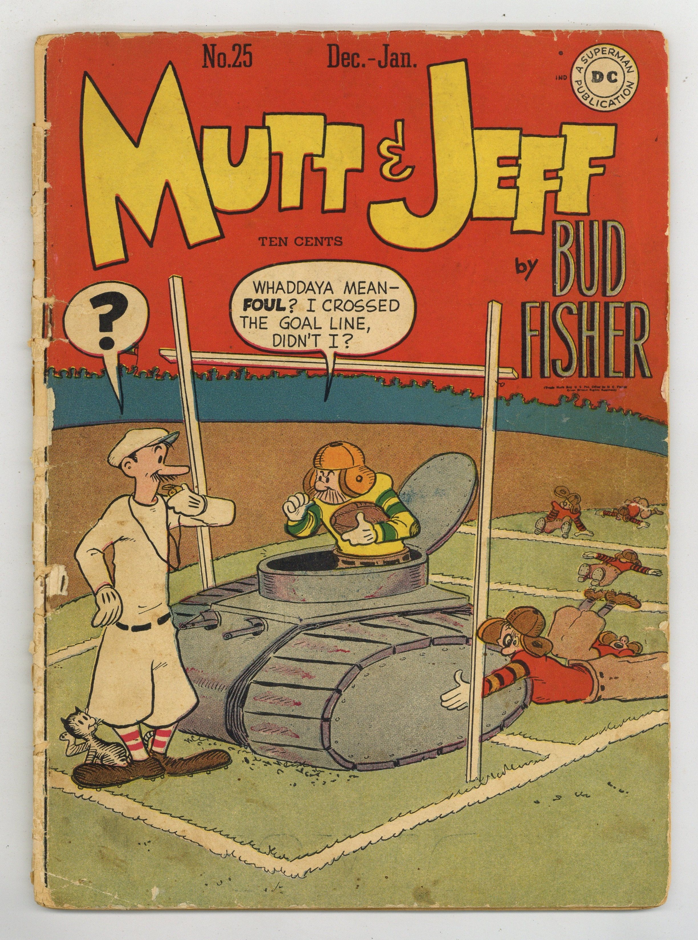 Cover by Sheldon Mayer (credited as Bud Fisher). Stories and art by Al Smith (credited as Bud Fisher), Charles King, Sol Hess, and W. A. Carlson. DC reprints the comic strip that defined the comic strip, featuring the original tall-and-short comedy duo. Also featuring the "topper" strip Cicero's Cat, and other strips from bygone days. Jeff invents an atomic cleaner and presser, but that's too much power for mere laundry. Cicero's Cat takes a job as a pet model. Jeff gets a job as yes-man to Hollywood producer Mr. Flicker. Mutt & Jeff; Cicero's Cat; Simp O'Dill; Out of the Bottle. 48 pages, Full Color. Cover price $0.10.