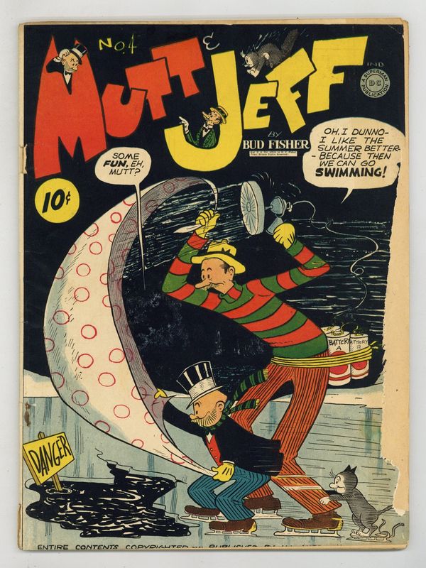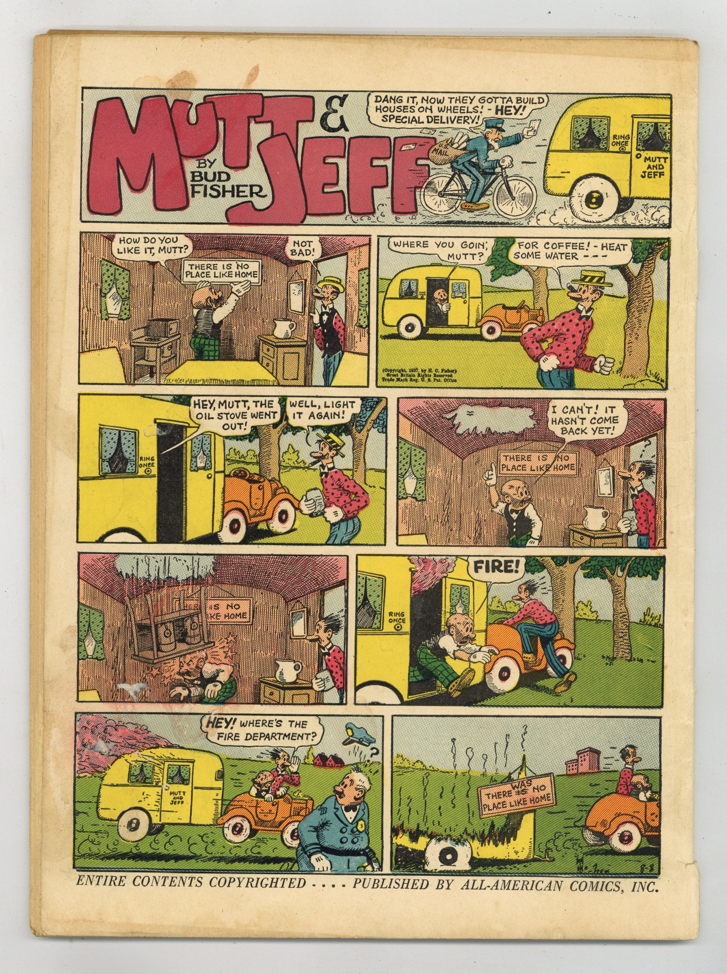 Cover by Sheldon Mayer (credited as Bud Fisher). Stories and art by Al Smith (credited as Bud Fisher). DC reprints the comic strip that defined the comic strip, featuring the original tall-and-short comedy duo. Jeff gets a new maid. Mutt explains his scientific approach to football. Cicero's Cat can't help taunting a chained-up dog, but that's never a good idea. Also featuring the "topper" strip Cicero's Cat, about the silent adventures of Mutt's pet feline. First issue to feature the DC Comics logo on the cover, plus a "managing editor" credit to M.C. Gaines, inventor of the comic book and founder of EC Comics. Mutt & Jeff; Cicero's Cat. 68 pages, Full Color. Cover price $0.10.