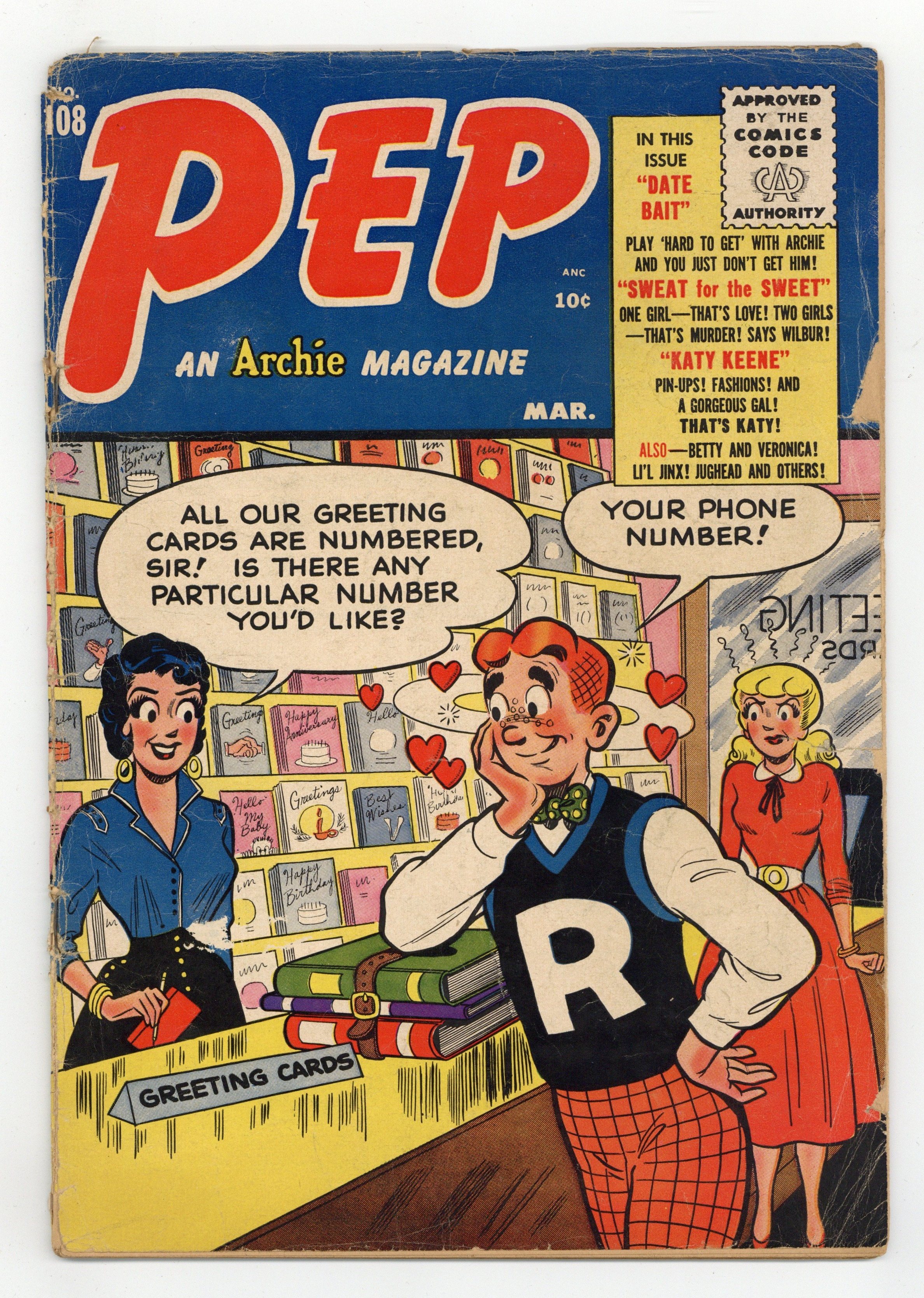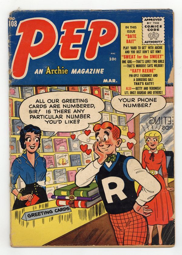 "The Son Also Rises"; Mrs. Andrews has a virus so Archie and his dad help around the house. "Par Pa"; Archie is practicing his golf swing with Veronica and hits a ball through Mr. Lodge's window. "Corn off the Cob"; Archie and Reggie perform a vaudeville style comedy act, until they are hooked off the stage. "Nervous with a Smile"; Betty has a toy flying saucer with spacemen that Mr. Lodge thinks is real. "Sweat for the Sweet"; Wilbur asks Linda to wrap a box of chocolates for Laurie, which she does, after stuffing the chocolates with hot peppers. Untitled story, script and art by Bill Woggon; Lucki Red Lorelei quits the ballet auditions because she's superstitious about the number thirteen and Katy gets the role. Katy's Ballet Pin-Ups page featuring Katy Keene, art by Bill Woggon. "The Mixed Fix" text story starring Archie. "Rabbit Transit"; The gang is putting on a play for charity; Jughead has to play a rabbit and after he puts on the costume, Archie tells him the zipper is stuck, even though it really isn't. "Raffles," script and art by Joe Edwards; Bill cant resist a pretty face selling raffle tickets; Upset after he's bought them, he's happy when he finds out he's won and the prize is a car. 36 pgs., full color. Cover price $0.10.