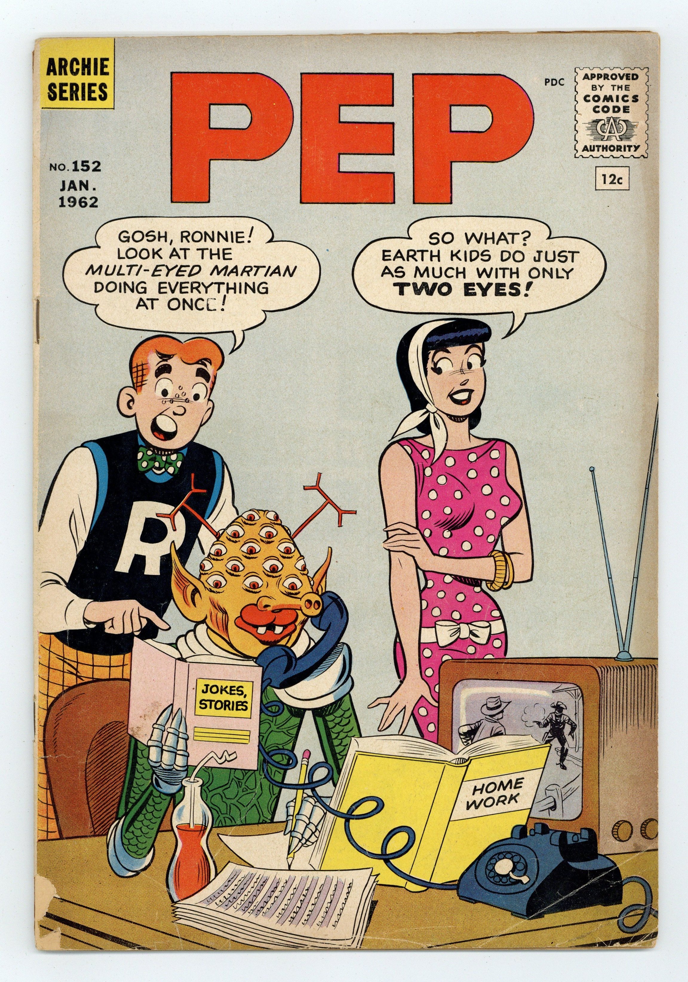 First 12-cent cover price. Cover art by Bob White. "To Tell the Truth," script by Frank Doyle, pencils by Dan DeCarlo, inks by Rudy Lapick; Archie's latest lab accident creates a gas that forces anyone who inhales it to tell the truth. "All State Star," script by George Gladir, pencils by Dan DeCarlo, inks by Rudy Lapick; Coach Kleats tells a reporter about all Moose's athletic records. "The Creature That Cried" starring Jaguar and Almor (first appearance), art by John Giunta. "Making a Name" starring Li'l Jinx, script and art by Joe Edwards. "Yo-Yo Yocks," script by Frank Doyle, pencils by Dan DeCarlo, inks by Rudy Lapick; The boys get into the newly-revived fad for playing with yo-yos. 36 pgs., full color. Cover price $0.12.
