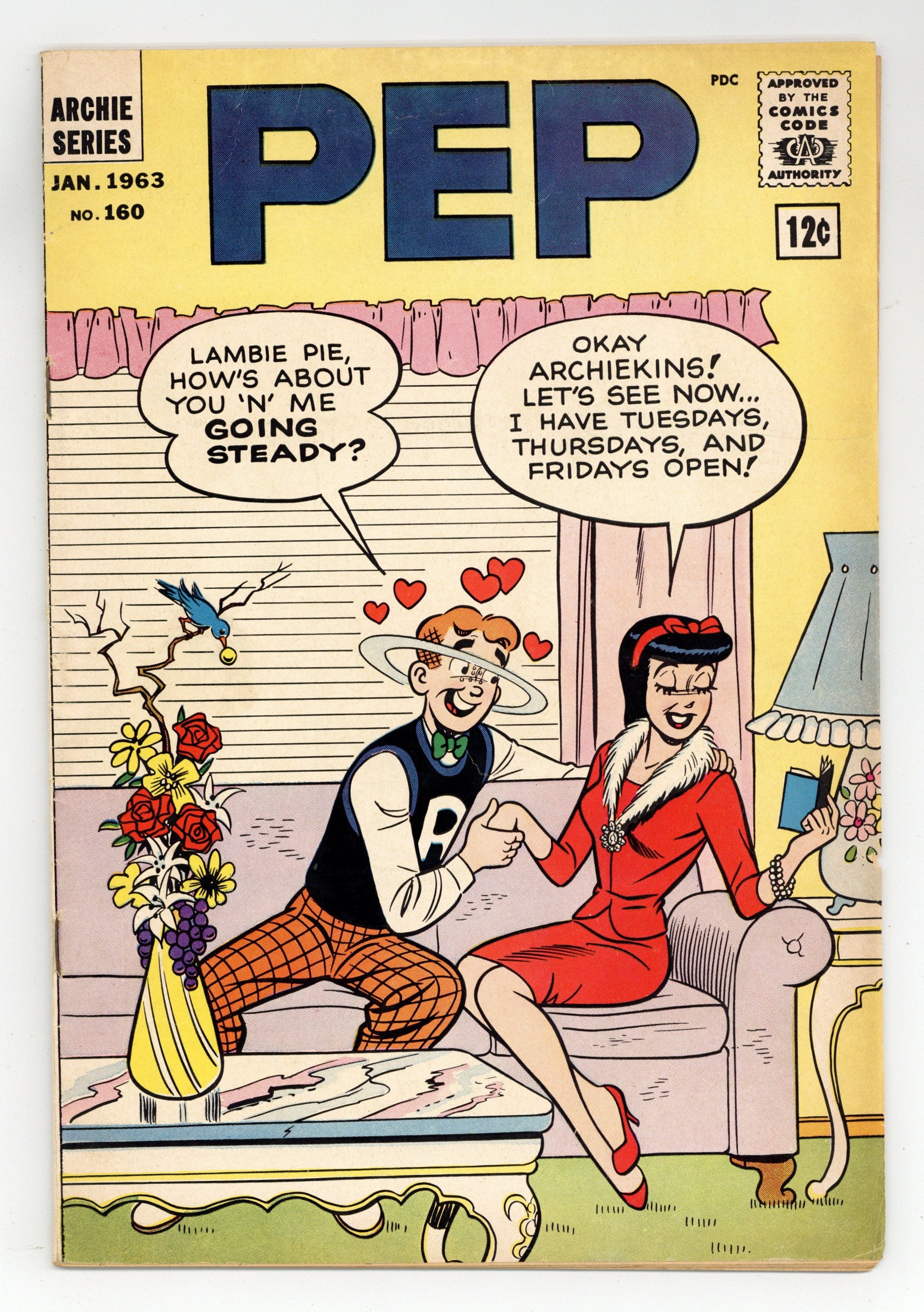 12¢ Cover Price Edition. "Point of View," art by Harry Lucey; The faculty is so used to the same old grind that they don't notice when a creature from outer space registers as a student. "Having a Ball" one-page story, art by Dan DeCarlo; Betty thinks Veronica has a bowling ball in the bag she brings to the bowling alley, but in reality it is just her makeup bag. "The Beast from Space," script by Robert Bernstein, art by John Rosenberger; A monster creature from outer space, curious about hydrogen bomb testing, comes to Earth; The Fly and Fly Girl are unable to stop it until they lure it to an H-bomb test. Archie's Christmas Stocking ad. "Big Business," script and art by Joe Edwards; Jinx finds no buyers for her old toys until she starts giving trading stamps. Archie Club News. "The Phantom," pencils by Harry Lucey; When Moose threatens to smash him after school, Archie tries to get a detention so he'll be kept after school; Unfortunately Archie's infractions are so blatant that Mr. Weatherbee thinks he's having hallucinations. 36 pgs., full color. Cover price $0.12.