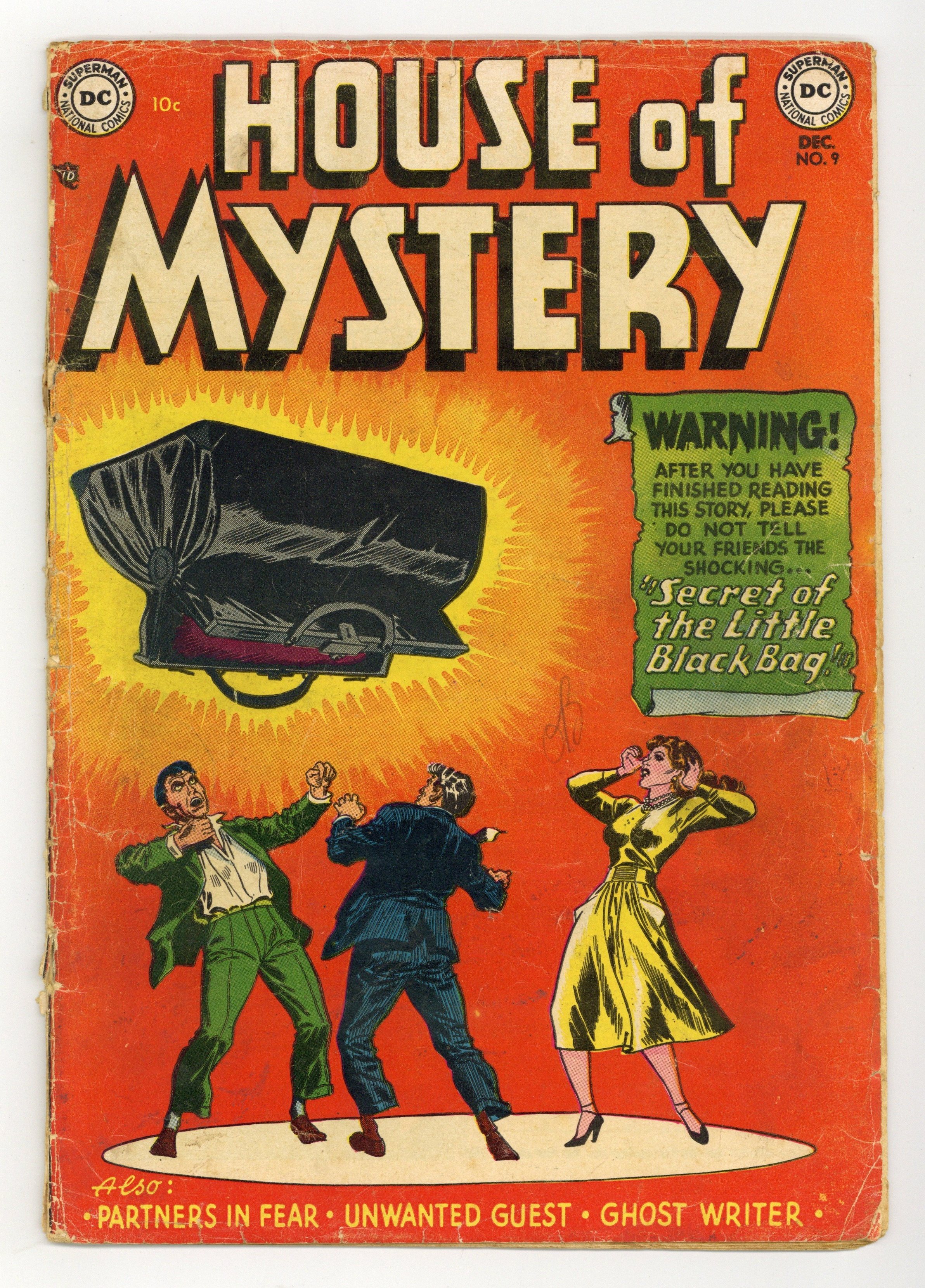 Cover by Ruben Moreira. "The Secret of the Little Black Bag!," art by Ruben Moreira; Louis the barber meets a childhood friend, Andy Decca; Decca is a rising counterfeiter in the mob hierarchy with contempt for the little people. "Partners In Fear!," art by Leonard Starr; Two friends try to outrival each other; One has high anxiety, the other goes mad with fear of falling. Unicef Spells Help for the Children of the World! public service announcement with Superman, script by Jack Schiff, art by Win Mortimer. "The Unwanted Guest!," art by Jerry Grandenetti; Englishman Mark Yeaton blackmails his American relatives and moves into their home, indulging in luxuries. 36 Pages, Full Color. Cover price $0.10.
