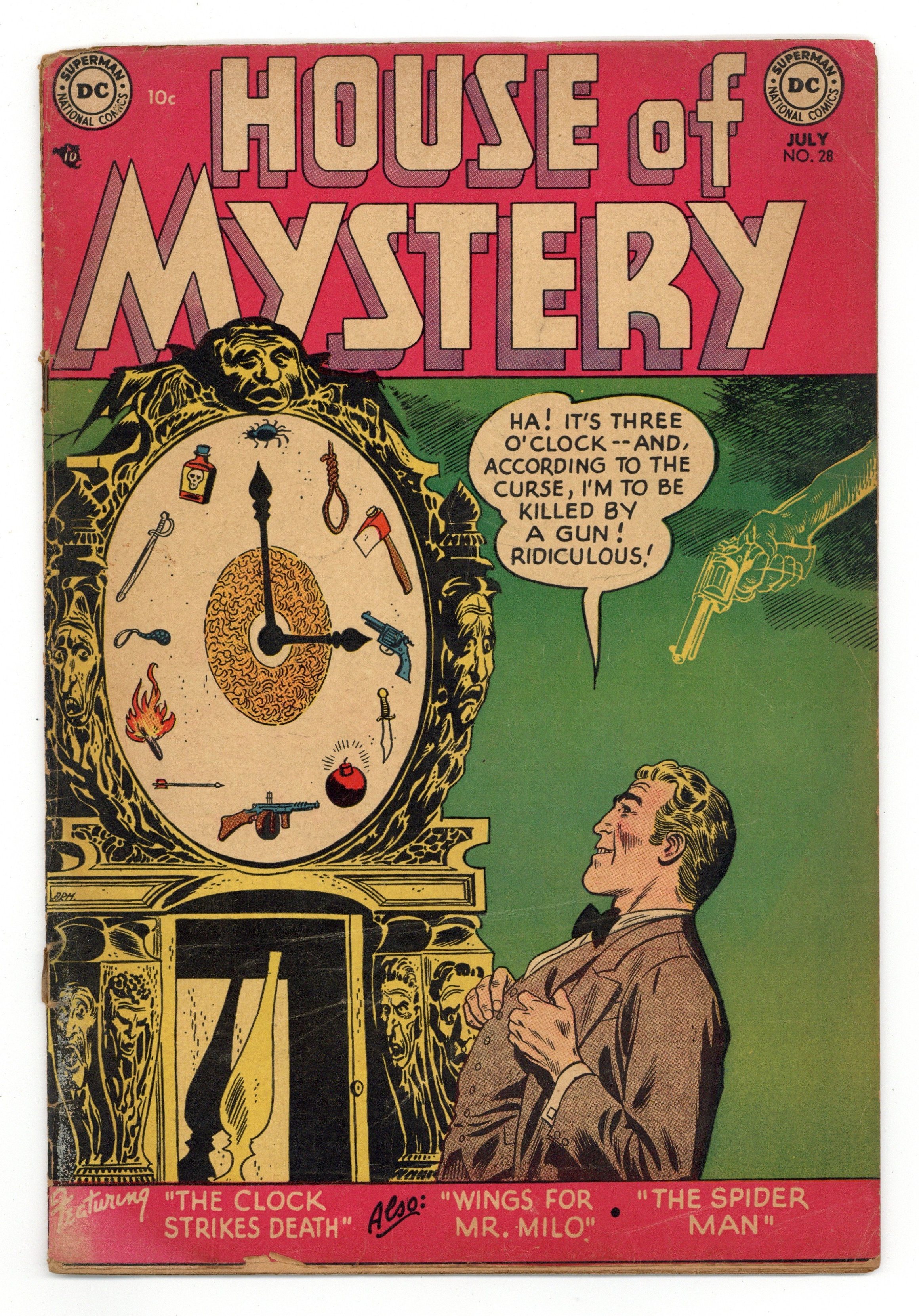 Cover art by Ruben Moreira. "The Wings of Mr. Milo!", pencils by Curt Swan; Men changing into birds and trying to commit financial fraud at the same time. "The Spider-Man!", art by Ed Smalle; A biologist meets with insect expert Weems. Weems collects insects inhabiting the spirits of people who just died; Looking for a "spider" person, Weems ironically turns out to be that next victim. "Saved by the Dead" one-page story. "The Secret Fear of Harvey Hall!", art by Nick Cardy; Psychiatrist Harvey Hall is a specialist for curing certain phobias; When he commits a crime he develops a phobia he has to battle. "Wolf Man" text story by Jack E. Miller. "The Clock Strikes Death!", art by Ruben Moreira; A timepiece releases the spirit of a long-dead killer; The police chief investigates, impersonates the ghost and uncovers a scam. 36 Pages, Full Color. Cover price $0.10.