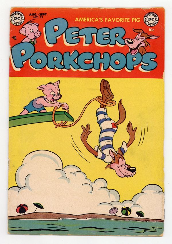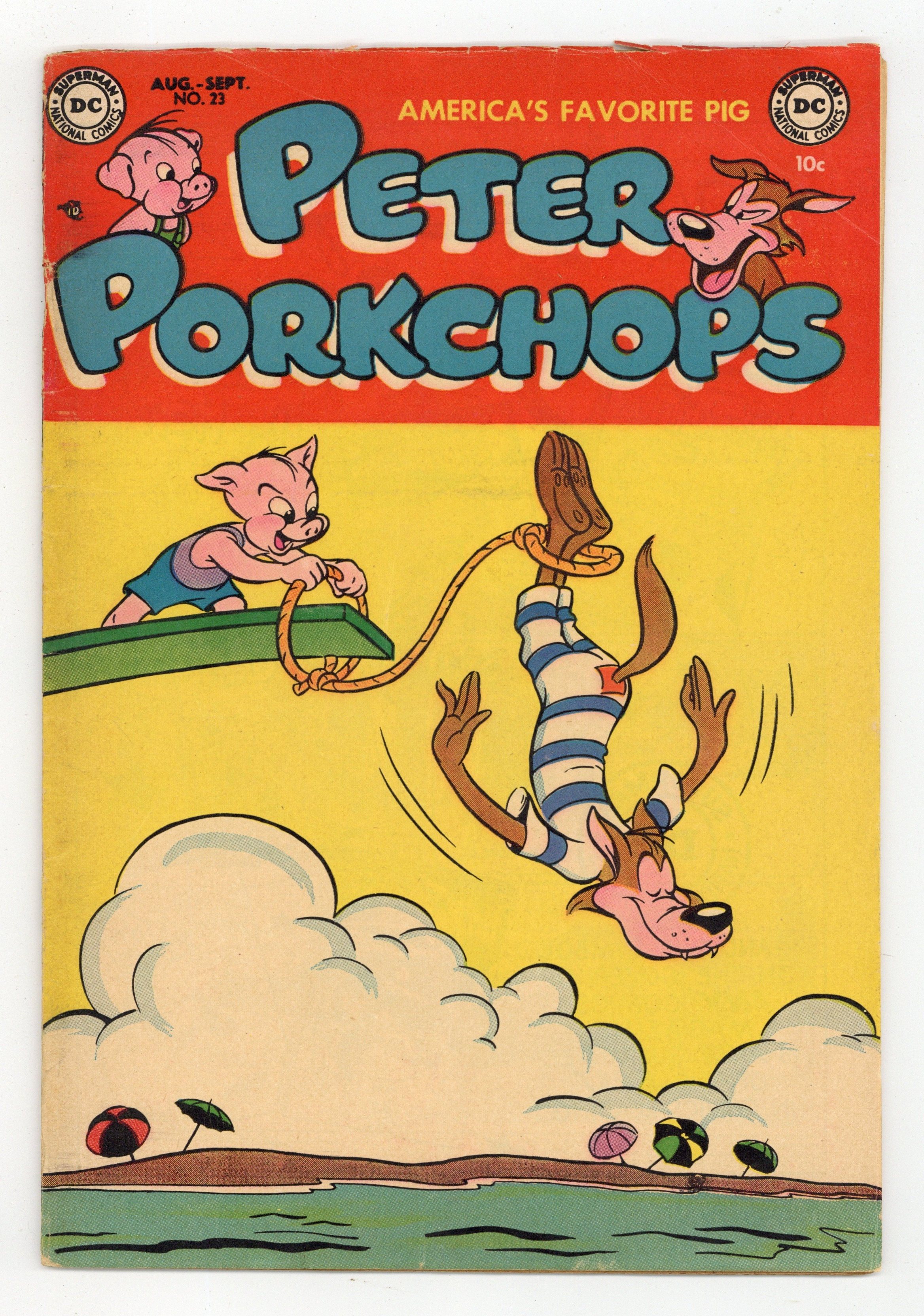 $22.00Cover art by Otto Feuer. Gold in Them Thar Hills!, art by Otto Feuer; Wolfie travels to Canada in search of gold but finds that Peter has beaten him to it, so he needs to figure out a way to steal Peter's gold. Untitled story, art by Otto Feuer; Wolfie tries to win a golf tournament by secretly giving Peter an exploding golf ball. Untitled story, art by Rube Grossman; Willy and Biggety get a job hanging wallpaper. The Clever Cuckoo text story. Untitled story, art by Otto Feuer; Peter tricks Wolfie into thinking he's slept for thirty years. Untitled story, art by Otto Feuer; Wolfie can't pay his hotel bill because he's lost his wallet. 36 pgs. $0.10. Cover price $0.10.