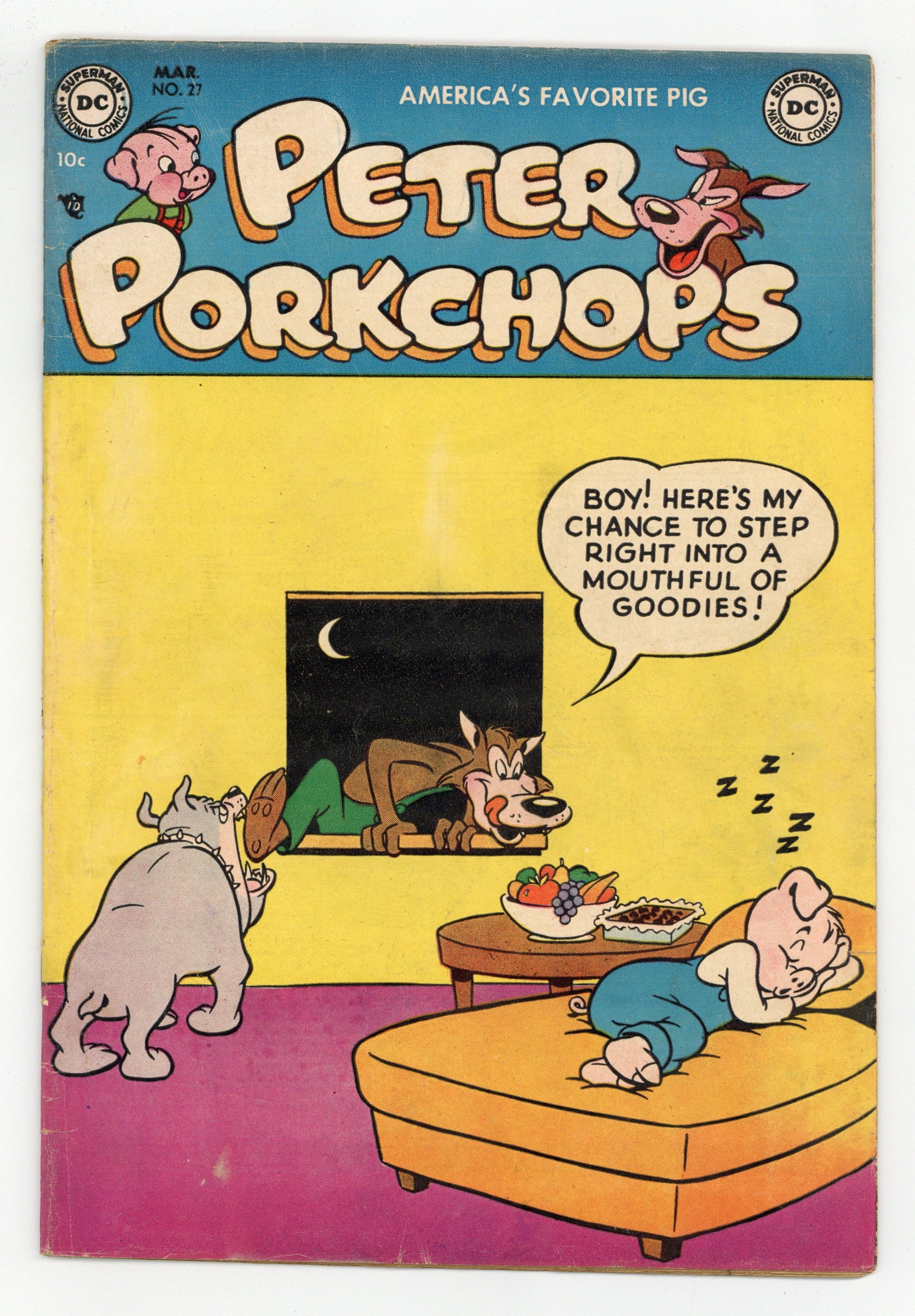 Cover art by Otto Feuer. Disguise the Limit!, art by Otto Feuer; Wolfie buys a disguise kit but Peter sees through all his attempts to look like someone else. Guilt on Stilts!, art by Otto Feuer; Wolfie buys a pair of stilts to stir up some mischief. Untitled The Tortoise and the Hare story, art by Rube Grossman; Harry wants to go moose hunting but he needs a new gun. Pal for a Day!, art by Otto Feuer; Wolfie announces that he is going to be Peter's friend and invites him to dinner but of course it's another trick. A Trip to the Moon text story. The Fox and the Crow ad, art by James F. Davis. Double Trouble!, art by Otto Feuer; Peter takes advantage of a visit from his twin cousin Oswald to really confuse Wolfie. 36 pgs. $0.10. Cover price $0.10.