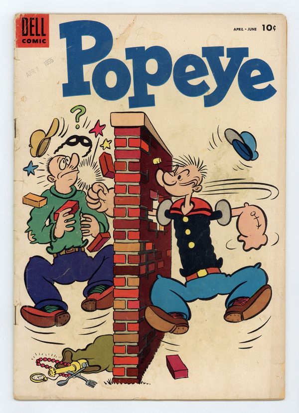 Cover art by Bud Sagendorf. Scripts and art by Bud Sagendorf. "Alone!" or "Hey! Where Is Everybody?" or "Peoples Is All Gone!"; The Sea Hag wants to kidnap Popeye, but her henchman doesn't know what Popeye looks like so he takes nearly everyone else in town, forcing Popeye to go and rescue them. Lorst!; This flashback story explains how Popeye made his first million dollars by prospecting for gold. Untitled story; Axle decides to plant a lawn around his house and works hard on it, but when Cam tries to help things get spoiled. Catfish text story. Untitled one-page story; Swee'Pea gets tangled up in a cactus. Based on the classic cartoon and comic strip character. 36 pages, full color. Cover price $0.10.