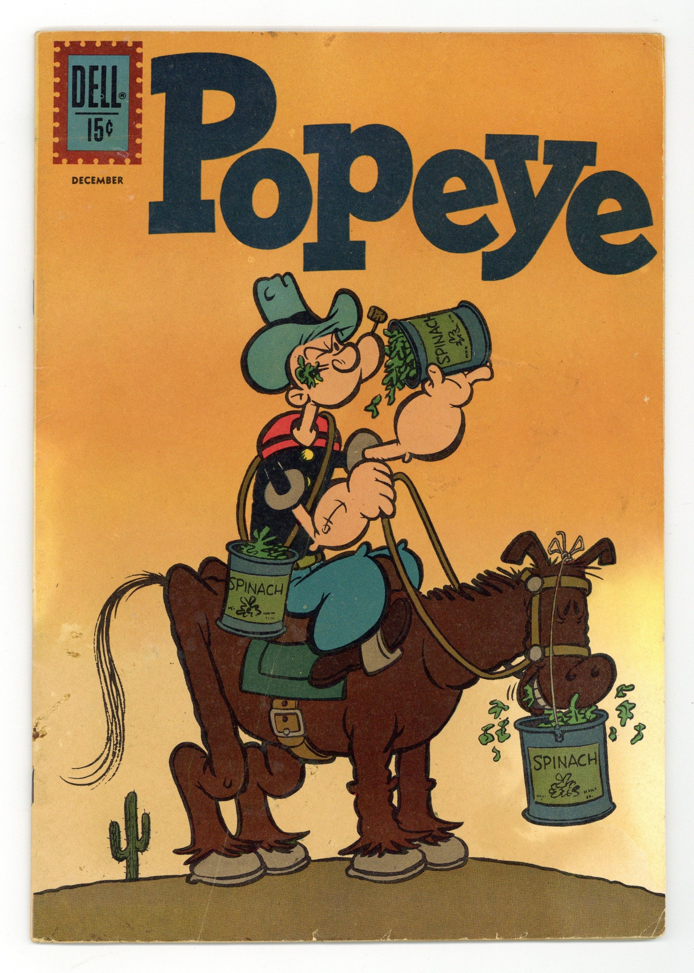 Nobody Home!, or, Gone Goons starring Popeye and Bluto. Elmo's Soup text story. At last! The world's most powerful magnet! starring O. G. Wotasnozzle. One Can of Spinach starring Popeye and Swee'Pea. Ball Bonanza starring Popeye. Cover and interior art by Bud Sagendorf. Based on the classic cartoon and comic strip character. 36 pages, full color. Cover price $0.15.