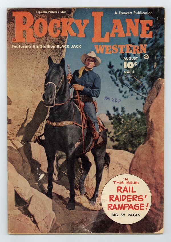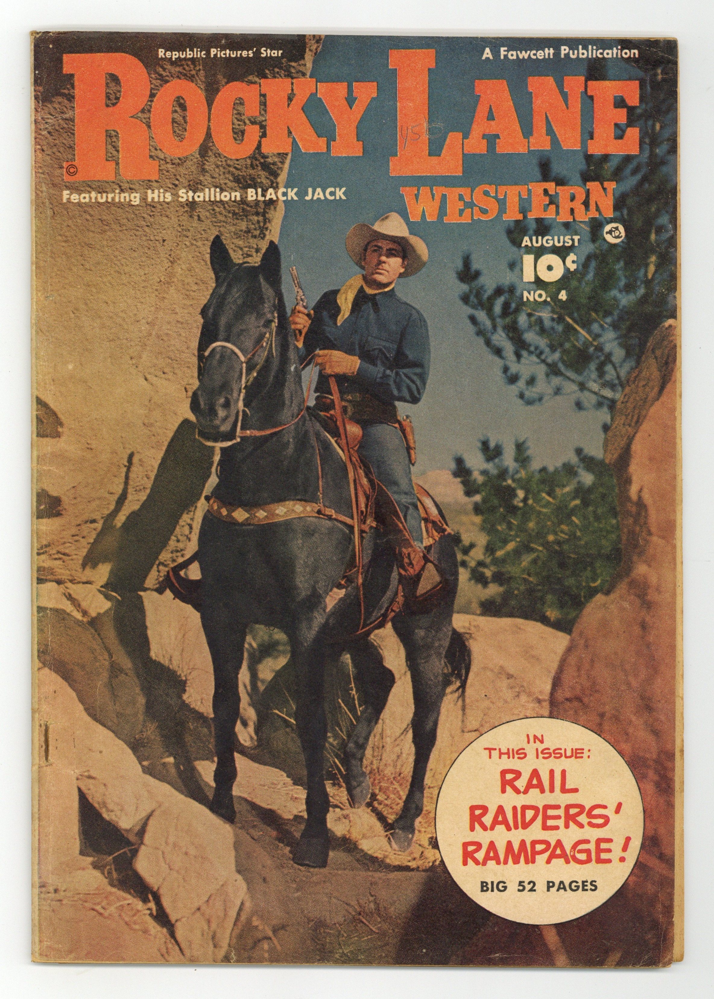 Stories and art by Ralph Carlson and others. Movie cowboy Allan "Rocky" Lane roams the West with a yen for justice. In an issue-length story, Rocky investigates reports of Native attacks on the Transcontinental railroad crews, and learns it's actually each rail crew trying to sabotage the other. Plus photo pinups of Rocky and his movie horse, Black Jack. And a vintage Tootsie Roll ad, Captain Tootsie to the Rescue!, with art by Shazam co-creator CC Beck. Rail Raiders' Rampage; Slim Pickens: The Photo Finish; Reliable Rustler; Majob The Magician; Condemned! 48 pages, Full Color. Cover price $0.10.