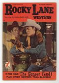 Published Dec 1949 by Fawcett/Charlton.$20.00Photo cover of Rocky Lane (Allan Lane) and Art Dillard, taken from Republic Pictures' The Wild Frontier. "The Sonset Feud," art by Ralph Carlson; Rocky gets in the middle of a clan feud. Rocky Lane Bandana ad. "The False Friendship," art by Ralph Carlson; Jobey receives notes threatening his life unless he turns over all the money he has hidden on his ranch. "The Non-Profit Bank Robbers," art by Frank Doyle; Rocky rides right into a bank robbery when entering town, and is wounded by a gunshot. Tom Mix Super-Magnetic Compass Gun ad. "Kill The Nester" text story by Walt Farmer. "Nothing Suits Him" starring Slim Pickens. "Blizzard Badmen's Bust-Up," art by Ralph Carlson; Rocky, as undercover Marshal, is in the Northwest Territory to protect the salmon fishermen. 52 pgs., full color. Cover price $0.10.