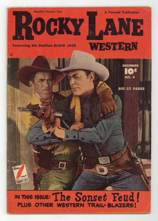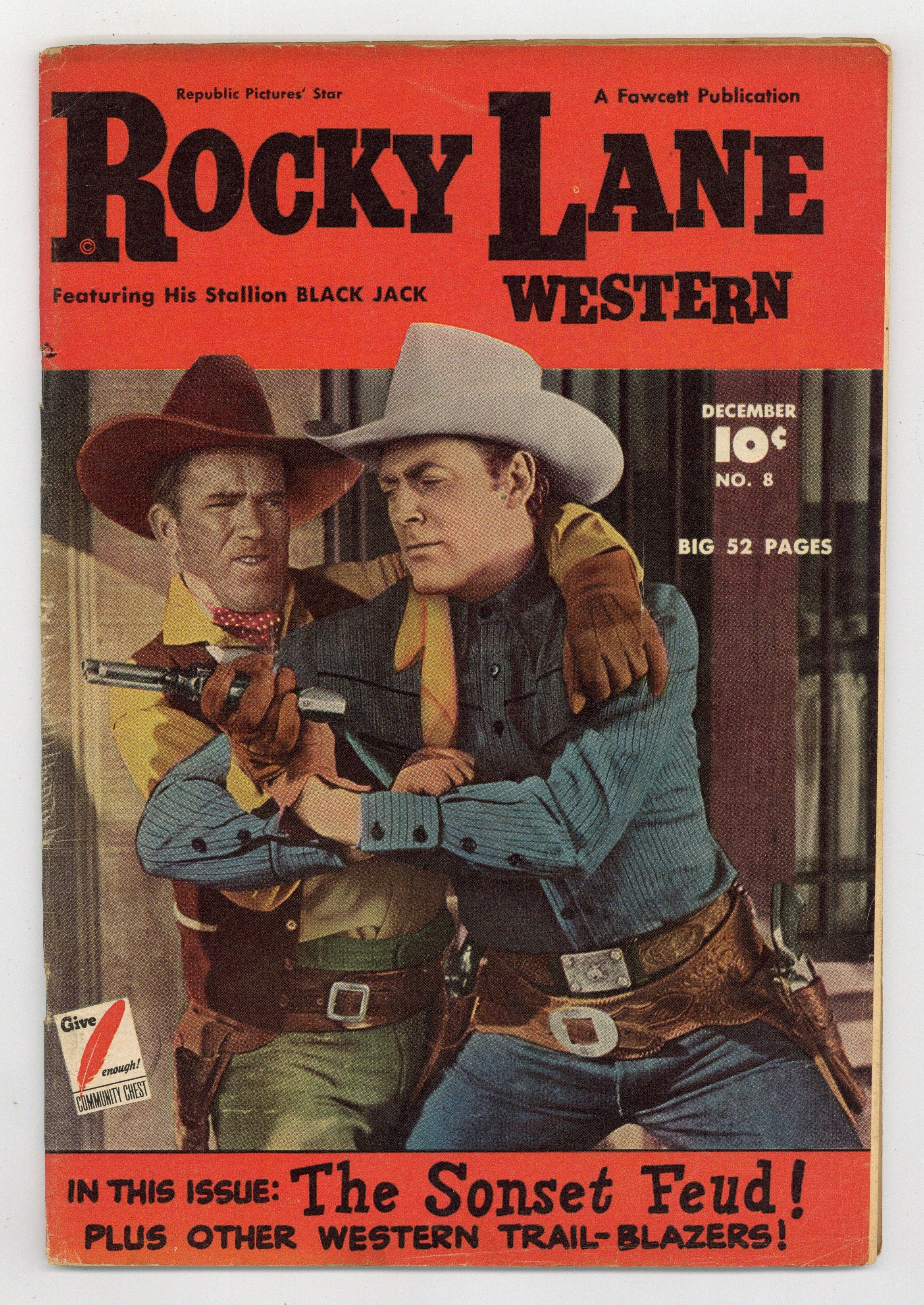 Published Dec 1949 by Fawcett/Charlton.$16.00Photo cover of Rocky Lane (Allan Lane) and Art Dillard, taken from Republic Pictures' The Wild Frontier. "The Sonset Feud," art by Ralph Carlson; Rocky gets in the middle of a clan feud. Rocky Lane Bandana ad. "The False Friendship," art by Ralph Carlson; Jobey receives notes threatening his life unless he turns over all the money he has hidden on his ranch. "The Non-Profit Bank Robbers," art by Frank Doyle; Rocky rides right into a bank robbery when entering town, and is wounded by a gunshot. Tom Mix Super-Magnetic Compass Gun ad. "Kill The Nester" text story by Walt Farmer. "Nothing Suits Him" starring Slim Pickens. "Blizzard Badmen's Bust-Up," art by Ralph Carlson; Rocky, as undercover Marshal, is in the Northwest Territory to protect the salmon fishermen. 52 pgs., full color. Cover price $0.10.