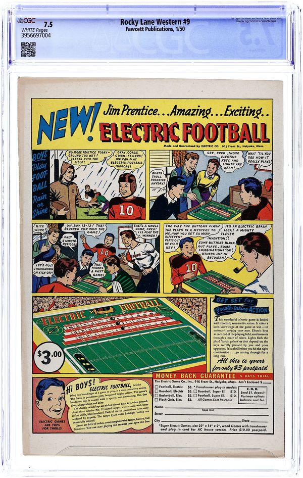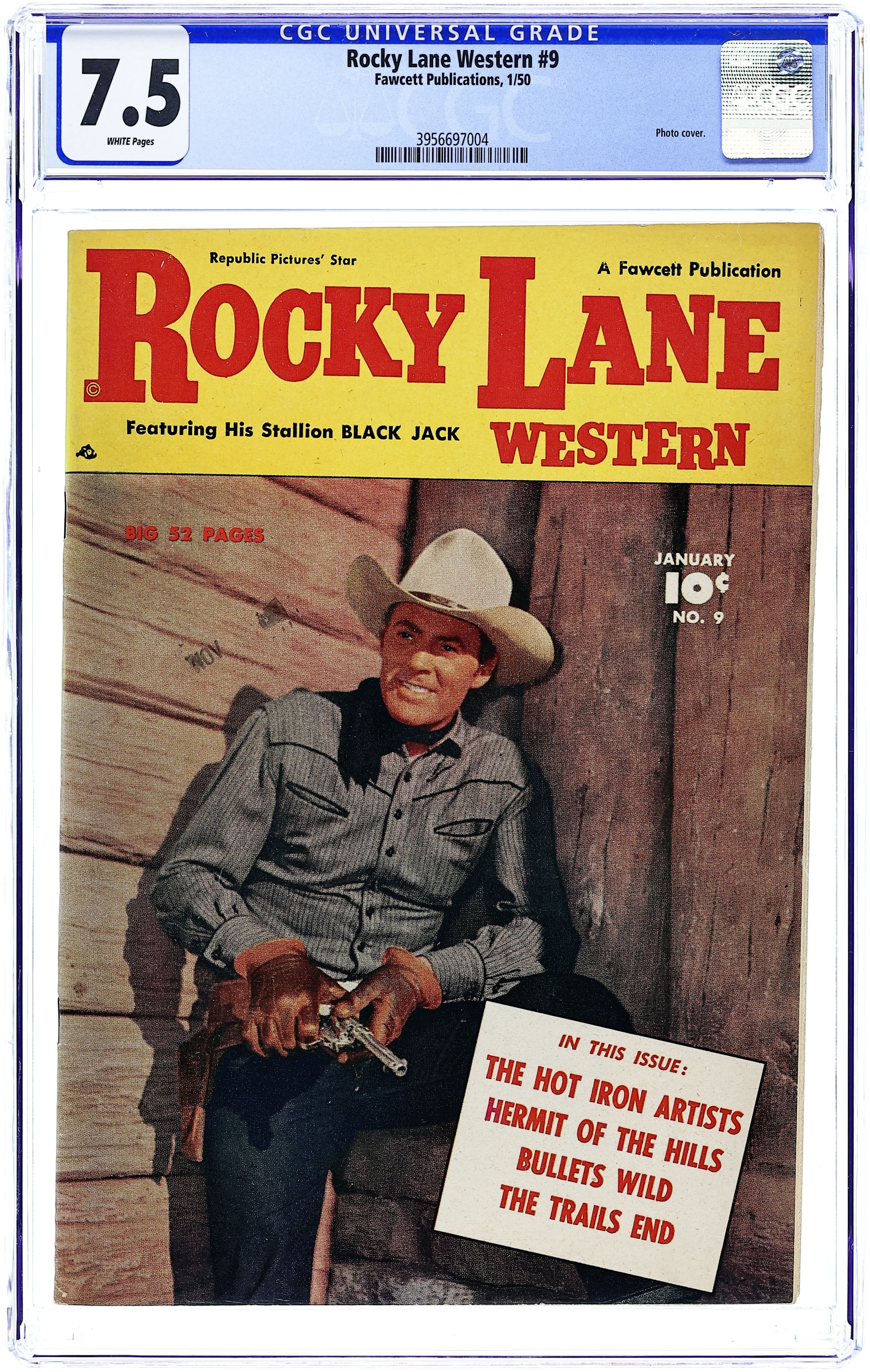 Movie cowboy Allan "Rocky" Lane roams the West with a yen for justice. During a drought, corrupt rancher Bronc figures out a complicated scheme to sell a neighbor his own rustled cattle, and get him framed for rustling to boot. Outlaws hijack a stagecoach and use it to pick up a gold shipment. Rocky gets to the bottom of a gambler's marked-card scheme, thanks to his hermit pal Solitaire. Plus Comix Cards (like the later Marvel Value Stamps) featuring Capt. Marvel Jr. And a vintage ad for "malted milk" featuring Rocky, "Rocky Lane Takes to the Air." The Hot Iron Artists; Sagebrush; Man of Courage; Hermit of the Hills; The Trail's End!; Gopherface; Slim Pickens: School Daze; Bullets Wild! 48 pages, Full Color. Cover price $0.10.