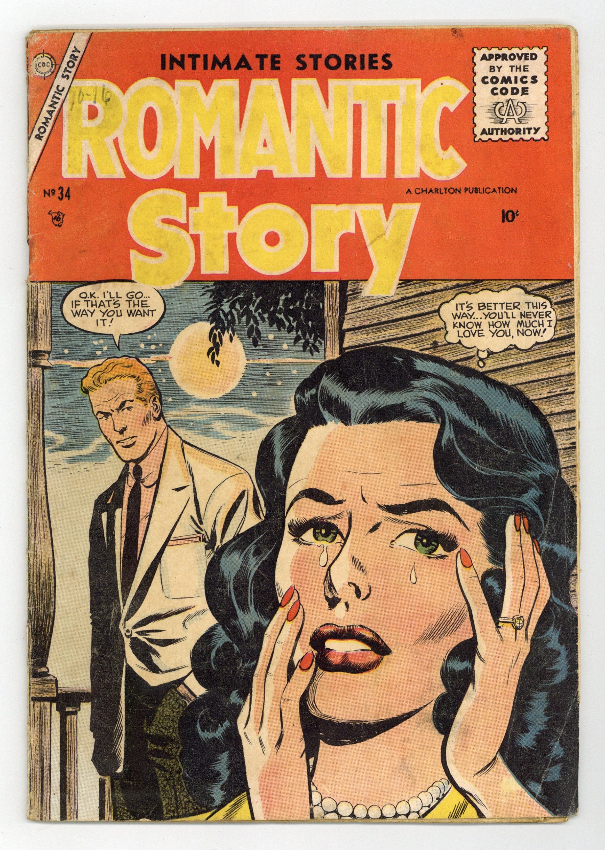 Cover by Dick Giordano. Stories and art by Dick Giordano, Charles Nicholas and Vince Alascia. Tales of secret love, heartbreak, unrequited love, and reconciliation. Mechanic Jack wants to marry Noreen, but she's afraid of winding up impoverished and overworked like her parents. Wealthy Diane wants to marry engineer Allen, but her controlling family wants to approve him first. A woman falls for the handsome man she sees every day, not realizing he's a cop secretly assigned to protect her. Look for the Sun; Man in My Heart; Family Crisis; What, You Again?; Old Maid; No Mail; True Love; Stars in My Eyes. 32 pages, Full Color. Cover price $0.10.