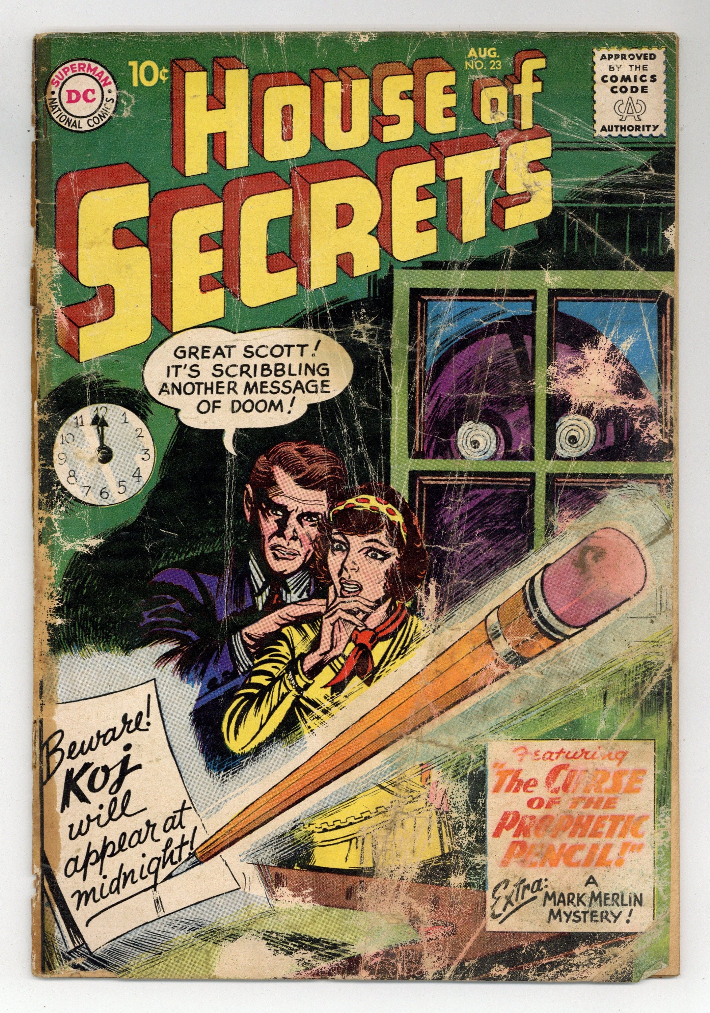 Cover art by Bernard Baily. "I Scout Earth's Strangest Secrets!", art by Mort Meskin; Mark Merlin describes three recent cases that he took on in his job as a supernatural investigator. Half-page Professor Eureka story by Henry Boltinoff. "The Creeping Creatures of Steel," art by George Roussos; Giant metal creatures at the Legend Land amusement park come to life and menace the patrons. "The Brief Life of Mr. Mechano" text story. "The Crazy House!" one-page story, script and art by Mort Drucker. "Tips on Summer Fun!" public service announcement starring Peter Porkchops, script by Jack Schiff, art by Otto Feuer. "The Curse of the Prophetic Pencil," art by Bernard Baily; A pencil inexplicably writes messages to a group of scientists, warning them that their experiments in teleportation will draw an other-dimensional creature to Earth. 36 Pages, Full Color. Cover price $0.10.