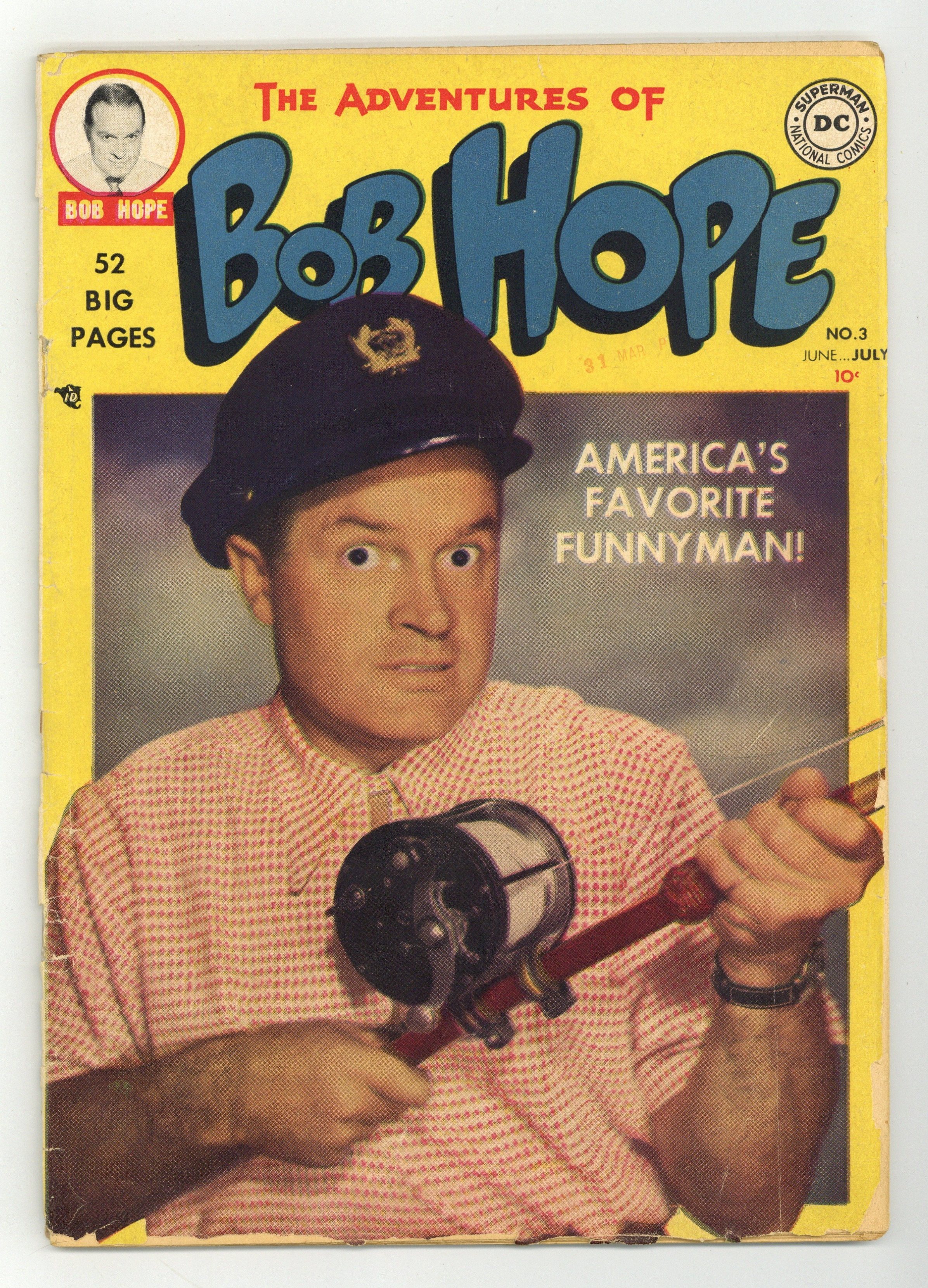 Photograph cover of Bob Hope. A Very Merry Mix-up!; Bob and Mrs. Peabody get involved in a bathing beauty contest at the beach. Wheaties ad with Phil Rizzuto. Video Laffs humor page by Harry Lampert. It Happens in Hollywood text article. A Salute to the Boy Scouts of America! with Superman, Batman, and Robin. 52 pgs. Cover price $0.10.