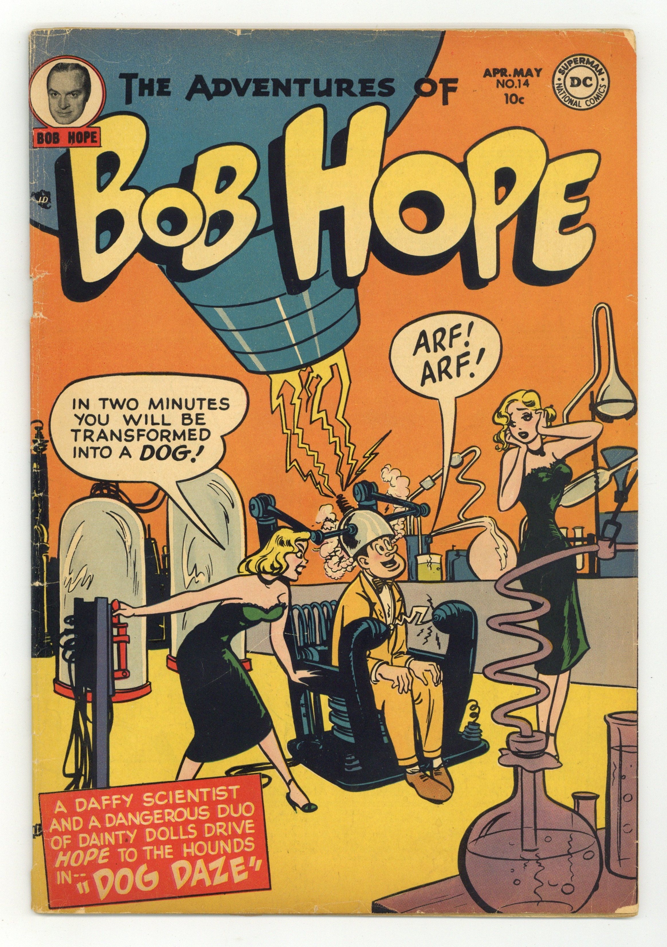 Cover by Owen Fitzgerald. Written by Cal Howard, Henry Boltinoff, Hy Mankin, Martin Naydel, Bob Irwin and unknown. Art by Owen Fitzgerald, Henry Boltinoff, Hy Mankin, Martin Naydel, Bob Irwin and Bob Oksner. A daffy scientist and a dangerous duo of dainty dolls drive Bob Hope to the hounds in "Dog Daze" by Cal Howard and Owen Fitzgerald. Plus: Varsity Vic 1-pager by Henry Boltinoff; Bill half-pager by Hy Mankin; Teen Teasers activity page by Martin Naydel; Peg 1-pager by Boltinoff; Life Ain't What It Seems half-pager by Bob Irwin; A Bit of Disc and Data article; Classical Corner article; Miss Beverly Hills of Hollywood back-up story, with art by Bob Oksner; and Jerry the Jitterbug 1-pager by Boltinoff. 40 pages, full color. Cover price $0.10.