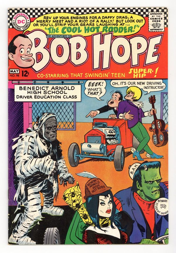 Cover by Bob Oksner. Written by Arnold Drake, Mort Drucker and Henry Boltinoff. Art by Bob Oksner, Mort Drucker and Henry Boltinoff. Rev up your engines for a daffy drag, a merry meet and a riot of a rally! But look out or you'll strip your gears laughing at..."The Cool Hot-Rodder!" by Arnold Drake and Bob Oksner. Starring Bob Hope, Super-Hip, Badger Goldliver, Doltish, Godfrey Goldliver, Lisa, Henrietta, Ruth the Wrecker, Zombia Ghastly and "Crash" Vyctum. Plus: Going Steady gag strips by Mort Drucker. And: Cap's Hobby Hints activity half-pager by Henry Boltinoff. 32 pages, full color. Cover price $0.12.