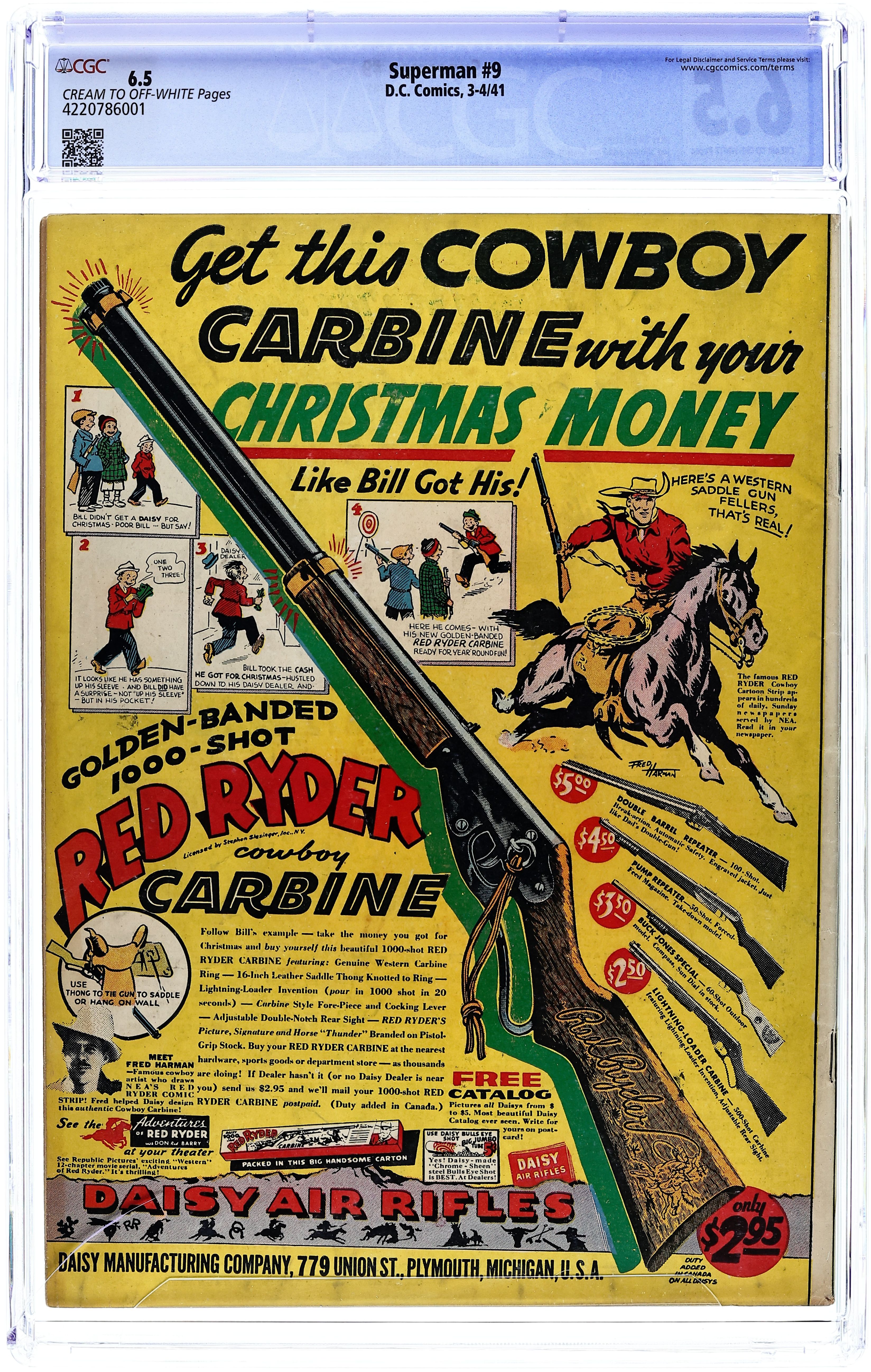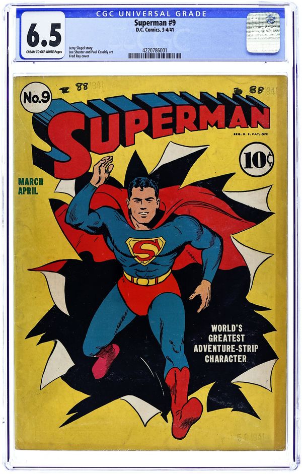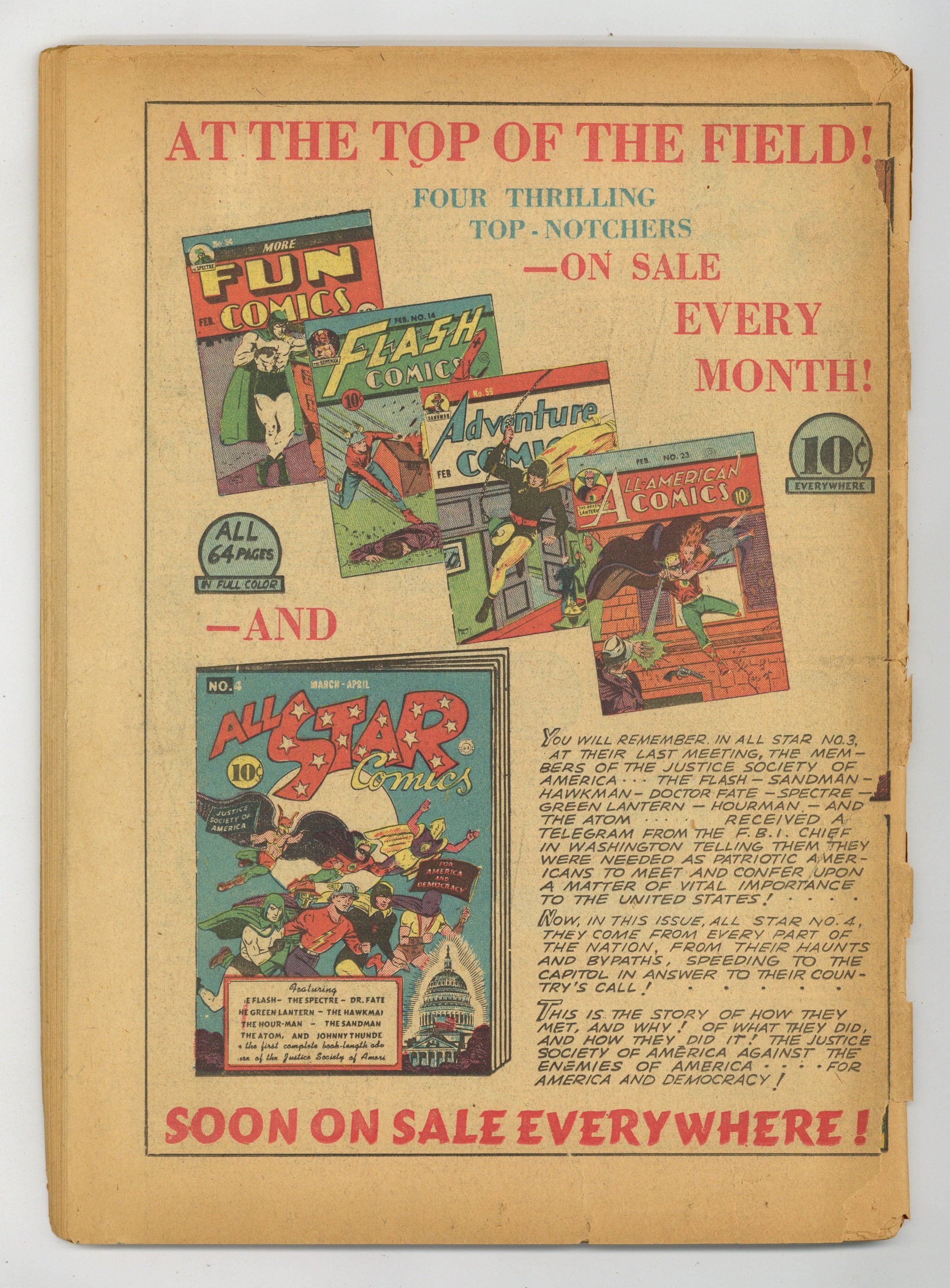 Cover art by Fred Ray. Untitled Superman story, script by Jerry Siegel (signed), pencils by Paul Cassidy [as Joe Shuster], inks by the Shuster Shop [as Joe Shuster]; Superman battles against some members of the Committee Against Militarism, whose leader is actually employed by a warring totalitarian nation. Supermen of America ad. Sport Spotlight on Surprising Veterans featuring Fred Fitzsimmons, Gene Sarazen, Max Baer, Ted Lyons, and Lefty Grove. Untitled Superman story, script by Jerry Siegel (signed), pencils by Paul Cassidy (?) [as Joe Shuster], inks by the Shuster Shop [as Joe Shuster]; Superman prevents Judge Crane from committing suicide, and, after talking with the judge, discovers that his daughter has been kidnapped. Untitled Superman story, script by Jerry Siegel (signed), pencils by Paul Cassidy (?) [as Joe Shuster], inks by the Shuster Shop [as Joe Shuster]; Editor White sends Clark out to Lamson Laboratories to get to the bottom of an unknown person or persons causing problems at the lab in an attempt to force the W-142 formula out of Lamson. A Bombing Flight text story, script by Frank Cooper, art by Fred Ray. Superman Physical Development Club article. Ad for Batman #4 and the Superman Radio Show. Untitled Superman story, script by Jerry Siegel (signed), pencils by Paul Cassidy [as Joe Shuster], inks by the Shuster Shop [as Joe Shuster]; The death of Morton Carling leads Lois, Sgt. Casey and Superman to uncovering the fact that the Jackson Jewelry Company was a front for a murder syndicate. 68 Pages, Full Color. Cover price $0.10.
