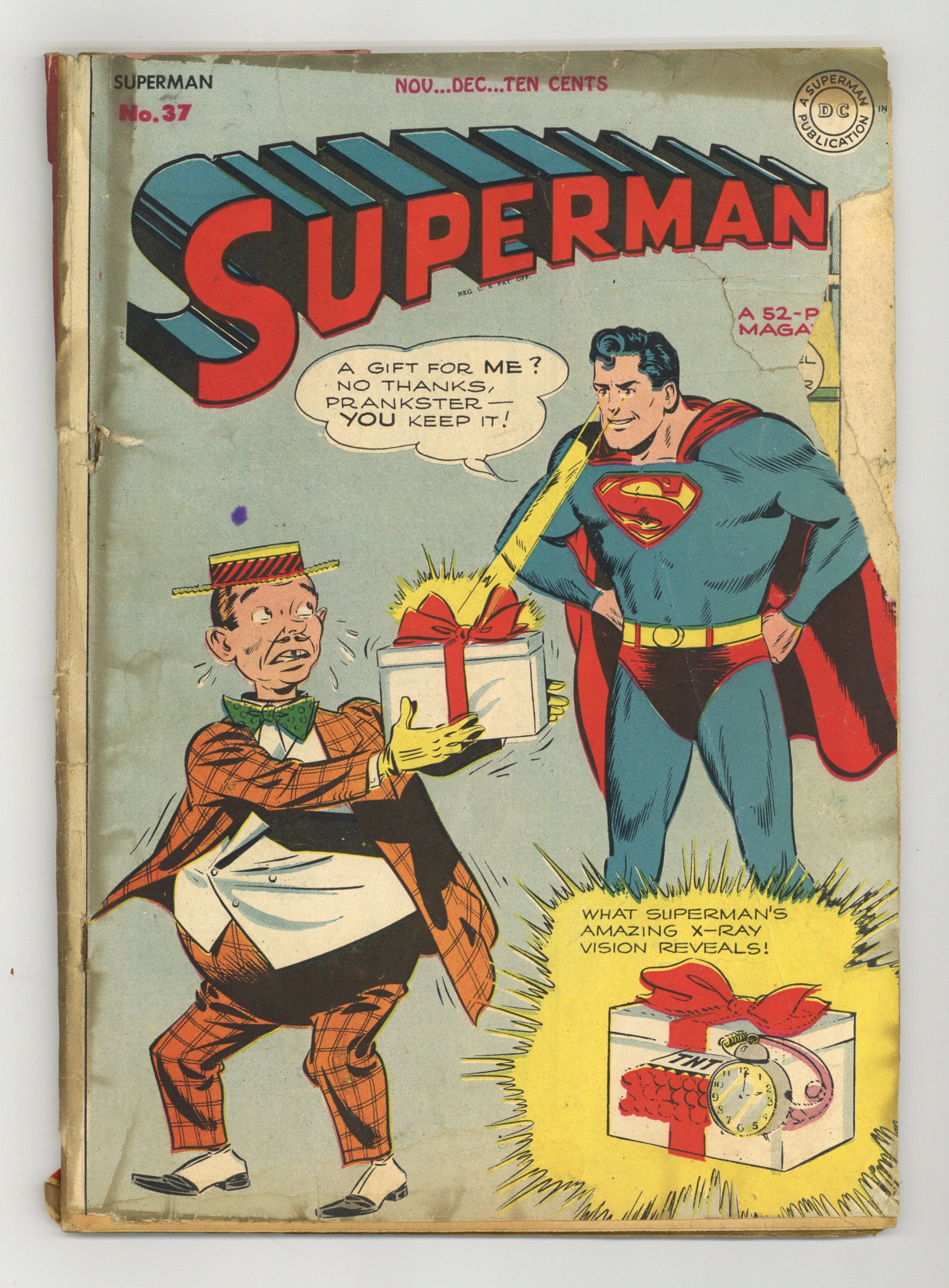 Tags: Superman$90.00- INCOMPLETE. Corner pieces torn from first and last page, slightly affects art and story. Staining throughout, crayon on last page and interior back cover.