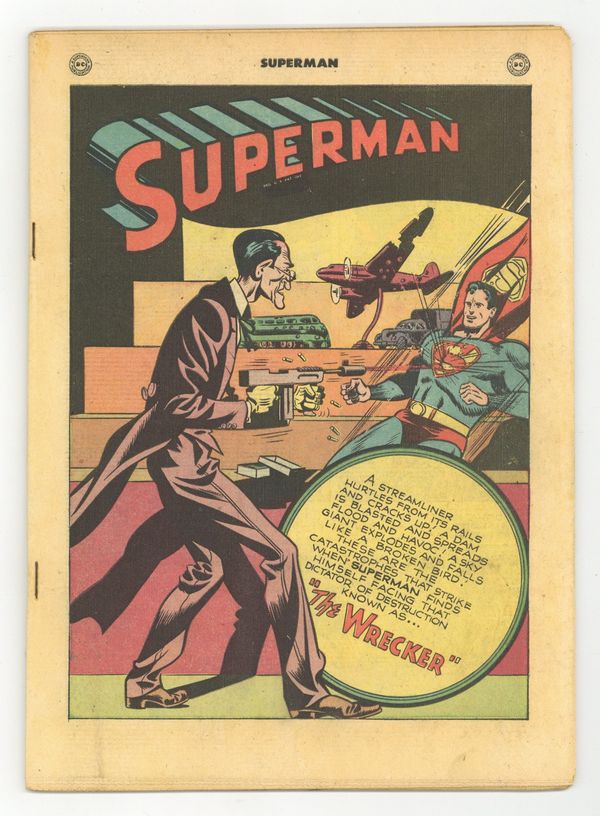 Cover pencils by Wayne Boring, inks by Stan Kaye. The Wrecker starring Superman and The Wrecker, script by Bill Finger, pencils by Wayne Boring, inks by Stan Kaye. The Secret of the Chinese Dragon starring Superman and the Wongs, script by Bill Finger, pencils by Wayne Boring, inks by Stan Kaye. Shorty humor two-pager by Henry Boltinoff. Her Majesty, Lois Lane starring Bobo, script by Joe Samachson, art by Al Plastino; Lois Lane briefly becomes queen of Cornovia. One-page Tootsie Roll ad, Captain Tootsie Traps Killer Bear with Invisible Light by C.C. Beck and Pete Costanza. Full page ad for Dale Evans #1. 52 Pages, Full Color. Cover price $0.10.